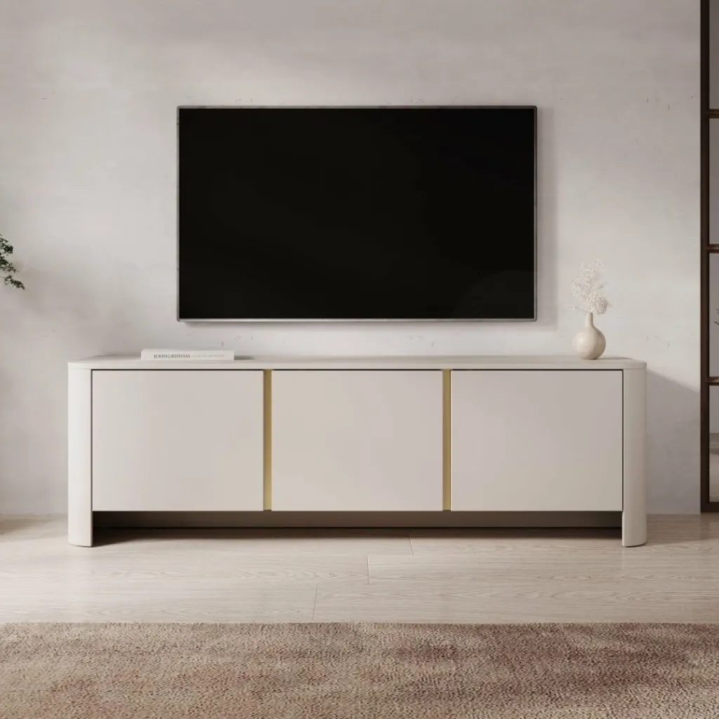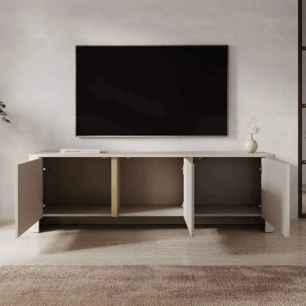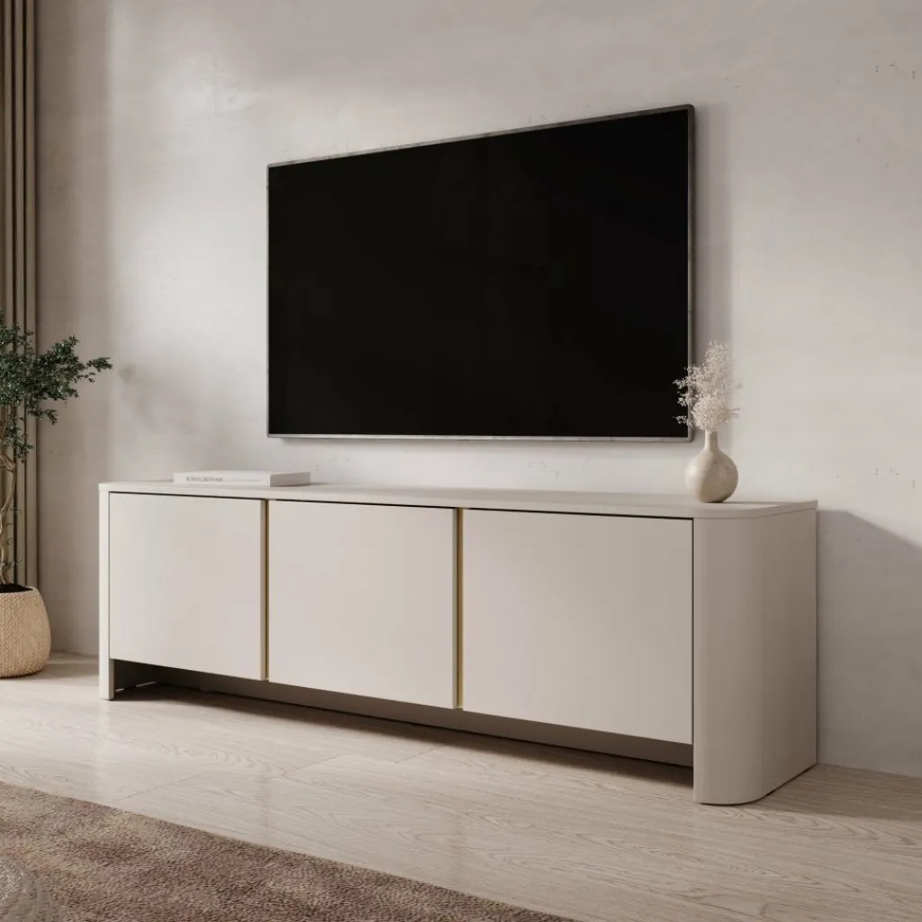 TV-Meubel Barbados is een strak en modern meubel uitgevoerd in een rustige beige kleur. Het design met afgeronde hoeken en greeploze deuren zorgt voor een minimalistische en elegante uitstraling, perfect passend in een eigentijds interieur.