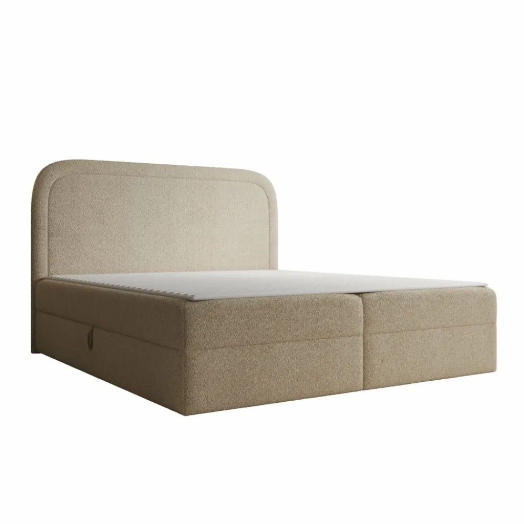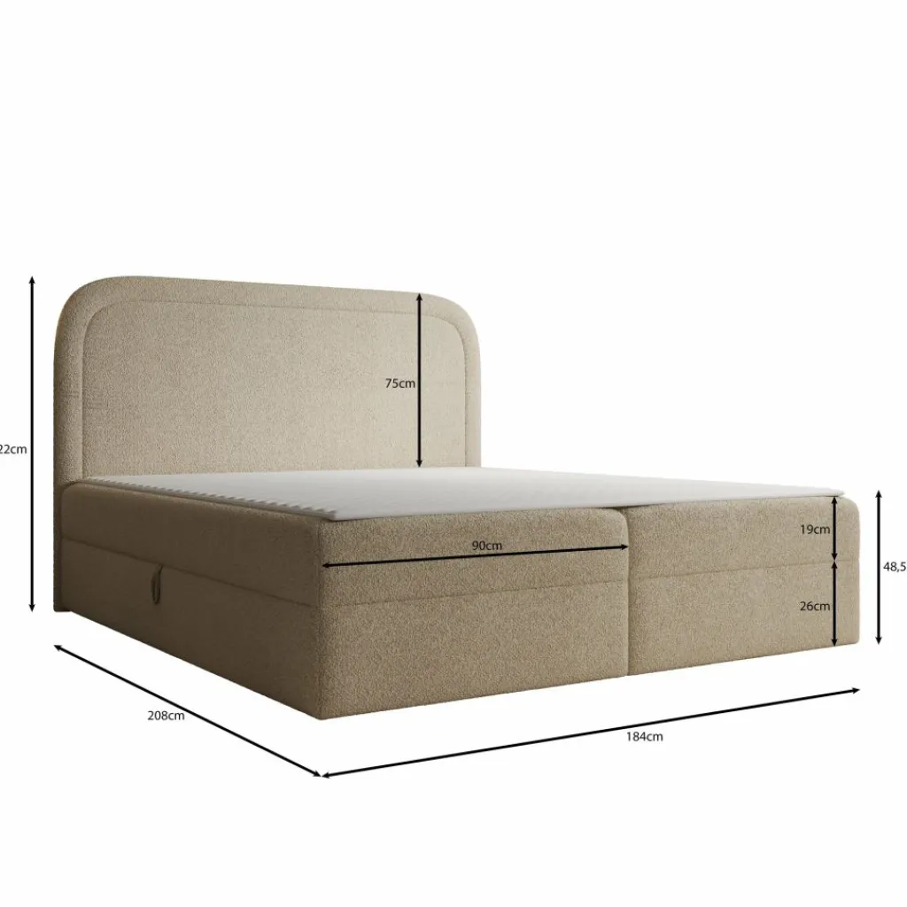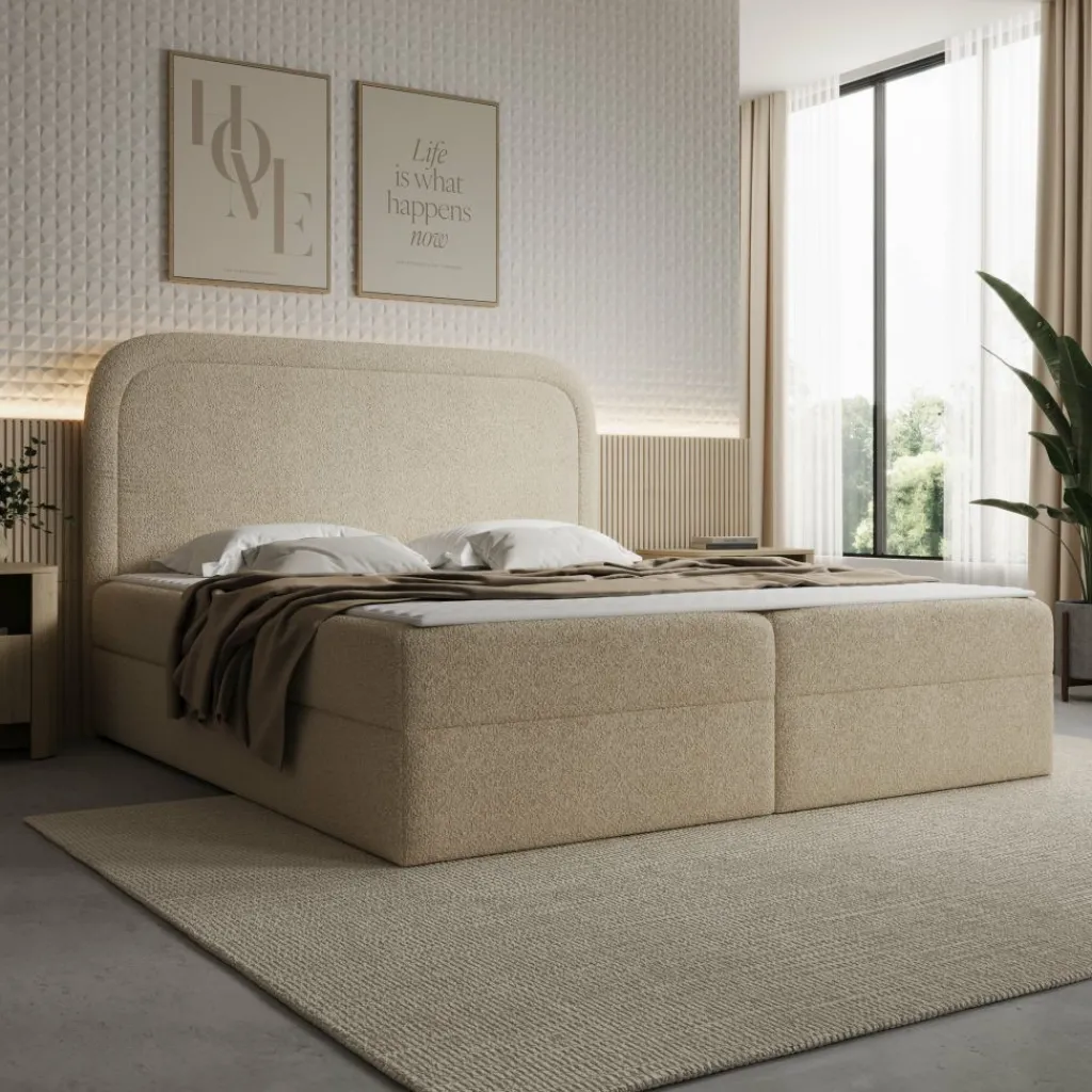 De Bastide boxspring in 180×200 cm biedt een ruime en comfortabele slaapoplossing met een zachte teddystof bekleding in beige. Het frame is opgebouwd uit 16 mm meubelplaat en hout. Het hoofdbord bevat meubelplaat, vurenhout en een laag van 1 cm T25-schuim gecombineerd met 300 g vezelvulling voor extra comfort.