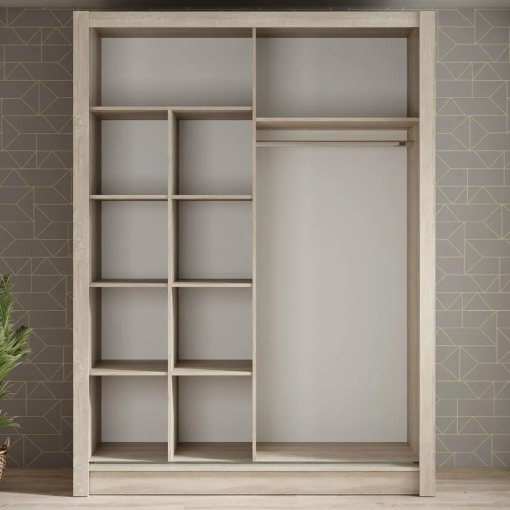 Achter de schuifdeuren vind je volop ruimte: een brede hangroede voor kleding die je netjes wilt ophangen én maar liefst tien open vakken voor het overzichtelijk opbergen van je garderobe, accessoires of beddengoed. De Bazarre is 155 cm breed en 214 cm hoog, en past door zijn rustige uitstraling goed in vrijwel elke slaapkamer.