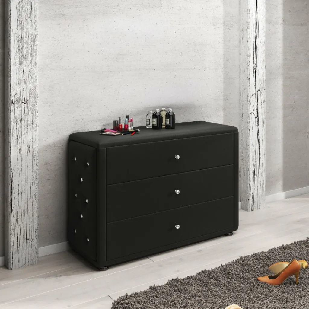 De Kaptafel Bedford is een stijlvolle make-uptafel met een luxe uitstraling. Dankzij de bekleding van zwart kunstleer en de subtiele diamantdetails in de zijkanten past deze kaptafel perfect in een moderne of glamoureuze slaapkamer. De drie ruime lades bieden voldoende opbergruimte voor make-up, sieraden en accessoires, zodat alles netjes en overzichtelijk blijft.