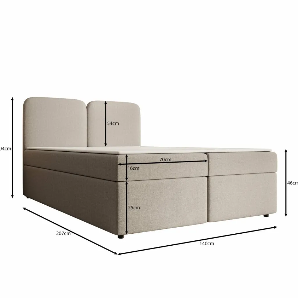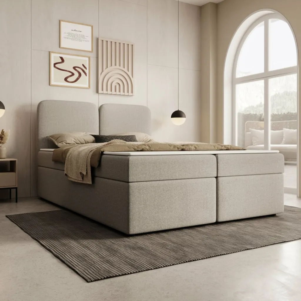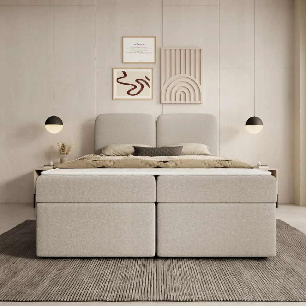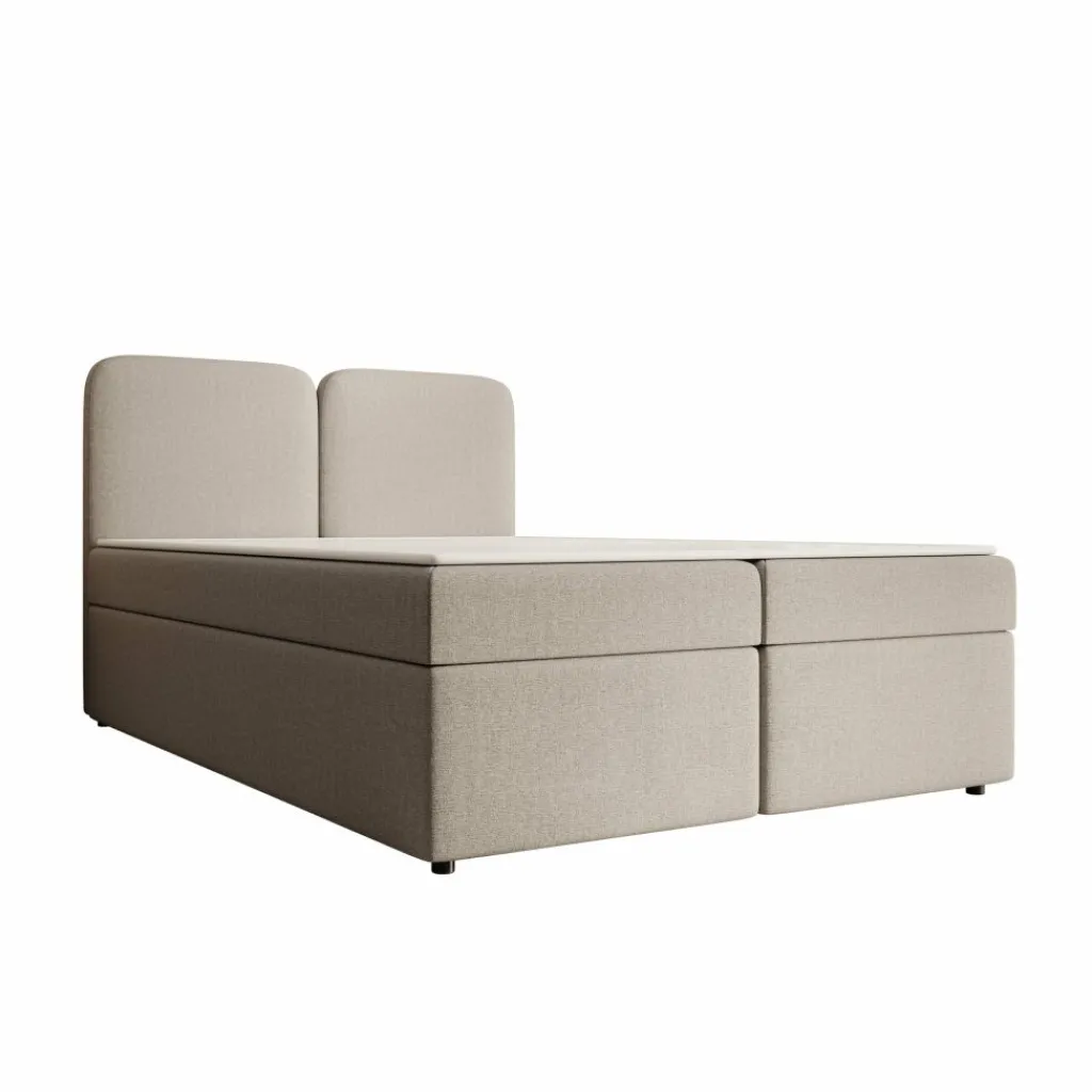 Het matras biedt gelijkmatige lichaamsondersteuning en vormt een stevige basis voor de nacht. Daarboven ligt een topper die het ligoppervlak egaliseert en bijdraagt aan een comfortabel geheel. De gestoffeerde afwerking in beige stof geeft het bed een neutrale uitstraling die eenvoudig te combineren is met verschillende slaapkamerstijlen. Het tweedelige hoofdbord met afgeronde vormen zorgt voor een herkenbaar en rustig aanzicht.