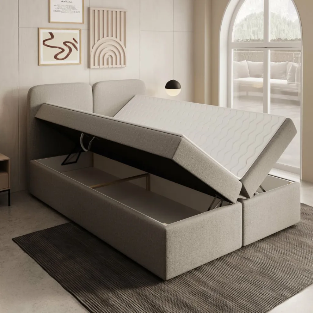 Onder het ligoppervlak bevinden zich ruime opbergvakken die toegankelijk zijn via het omhoog te openen matras. Dankzij het veermechanisme opent het bed licht en gecontroleerd, waardoor je eenvoudig dekbedden, kussens of andere spullen kunt opbergen zonder extra kasten nodig te hebben.