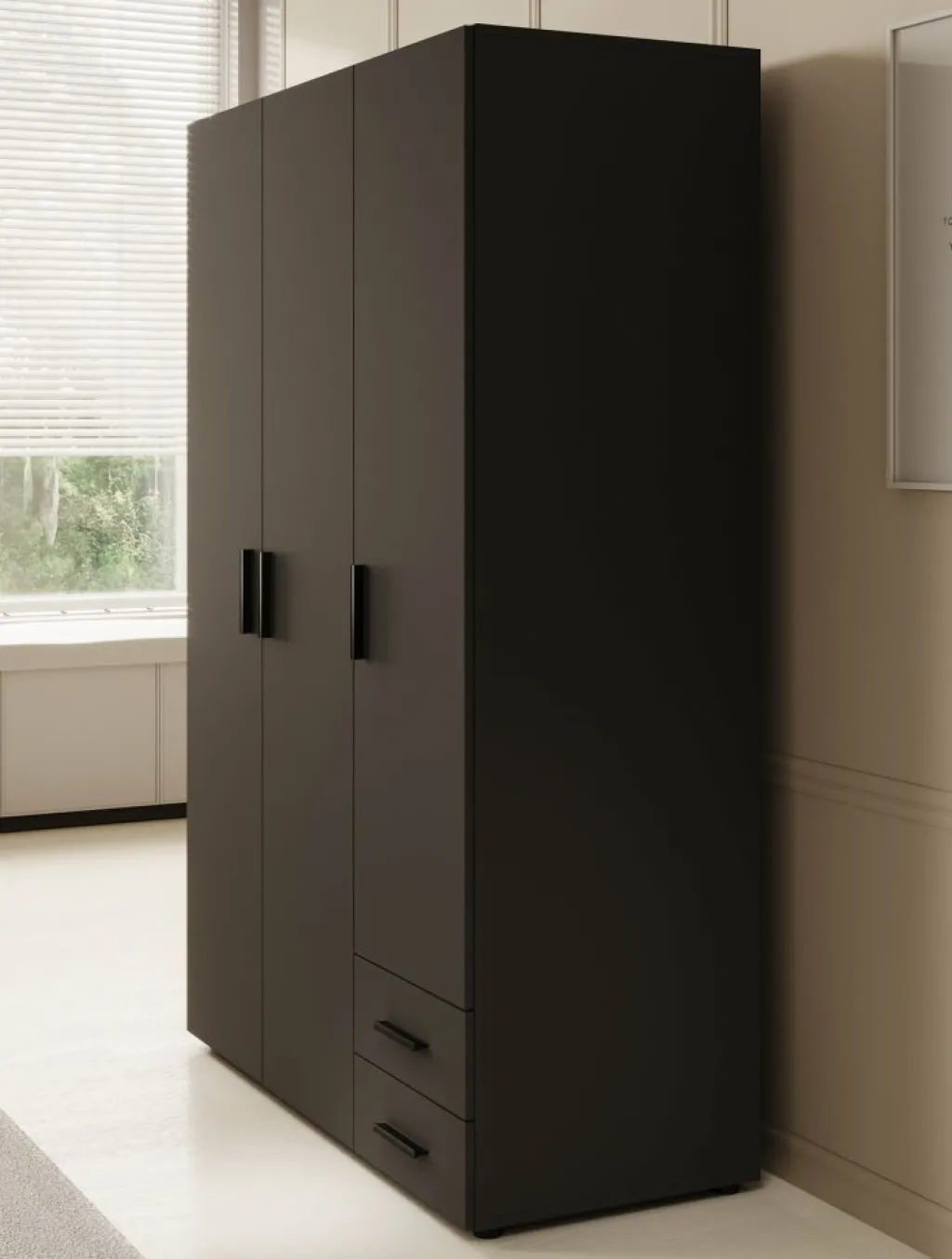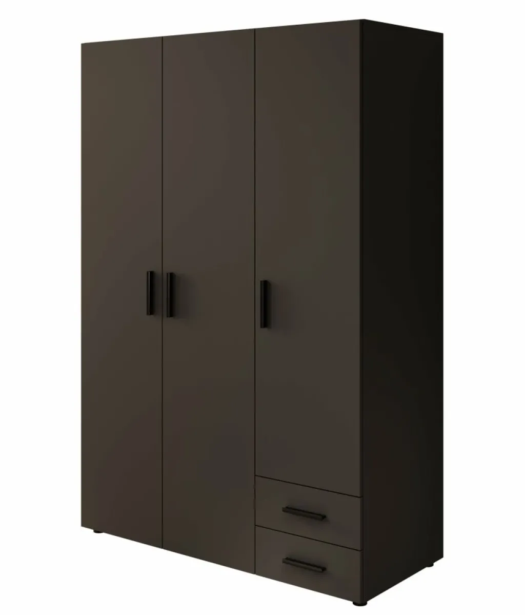Kledingkast Bellini is een moderne garderobekast in de kleur antraciet. Dit model is voorzien van 3 scharnierdeuren en 2 lades die openen met zwarte handgrepen. De binnenkant van de kast bestaat uit 4 opbergvakken en 1 kledingroede. De Bellini staat op pootjes.