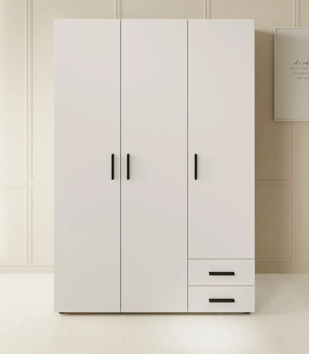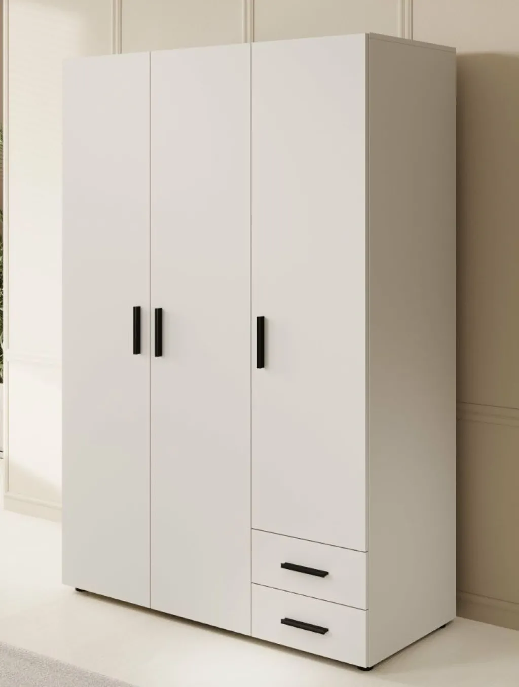 Kledingkast Bellini is een moderne garderobekast in de kleur wit. Dit model is voorzien van 3 scharnierdeuren en 2 lades die openen met zwarte handgrepen. De binnenkant van de kast bestaat uit 4 opbergvakken en 1 kledingroede. De Bellini staat op pootjes.
