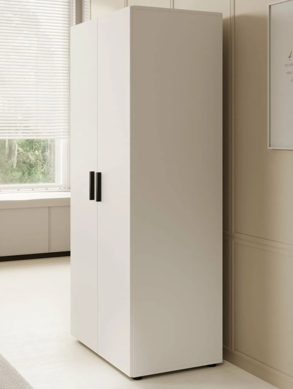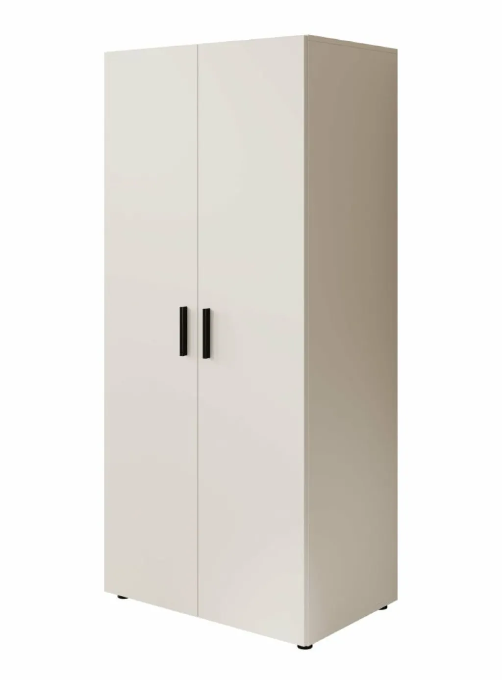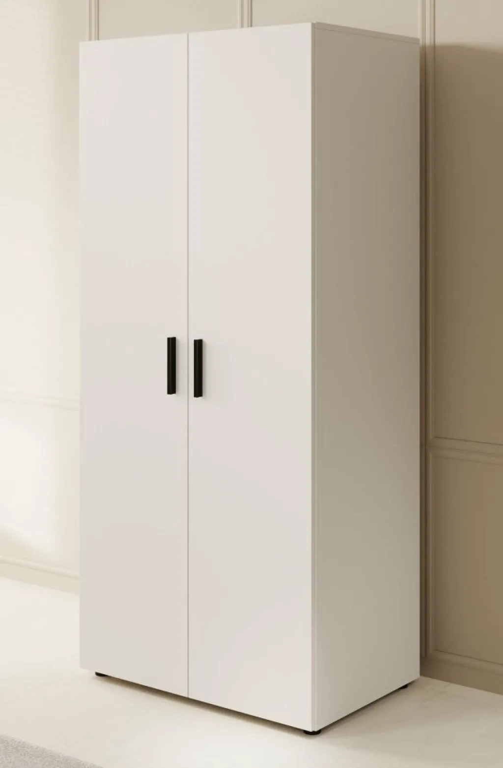 Kledingkast Bellini is een moderne garderobekast in de kleur wit met een eenvoudig design. Dit model is voorzien van 2 scharnierdeuren die openen met zwarte handgrepen. De binnenkant van de kast bestaat uit 1 opbergvak en 1 kledingroede. De Bellini staat op pootjes.