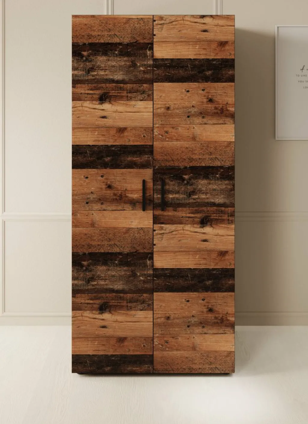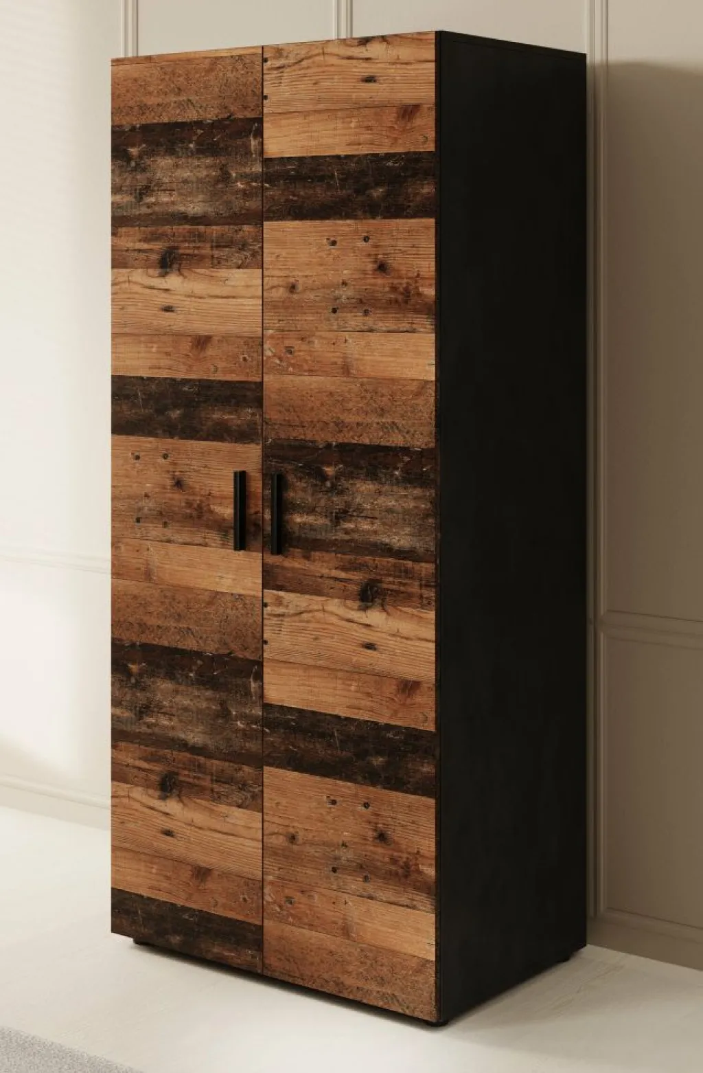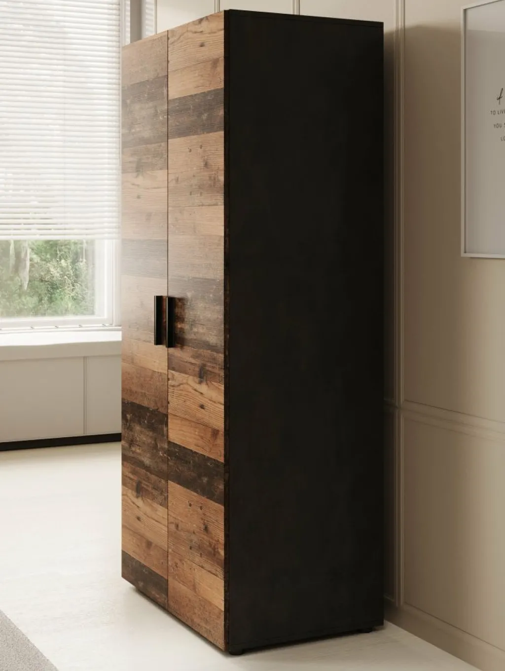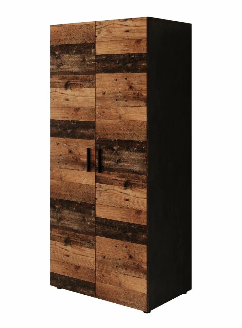 Kledingkast Bellini is een industriële, eenvoudige garderobekast in de kleur donker old wood met grijs. Dit model is voorzien van 2 scharnierdeuren die openen met zwarte handgrepen. De binnenkant van de kast bestaat uit 1 opbergvak en 1 kledingroede. De Bellini staat op pootjes.