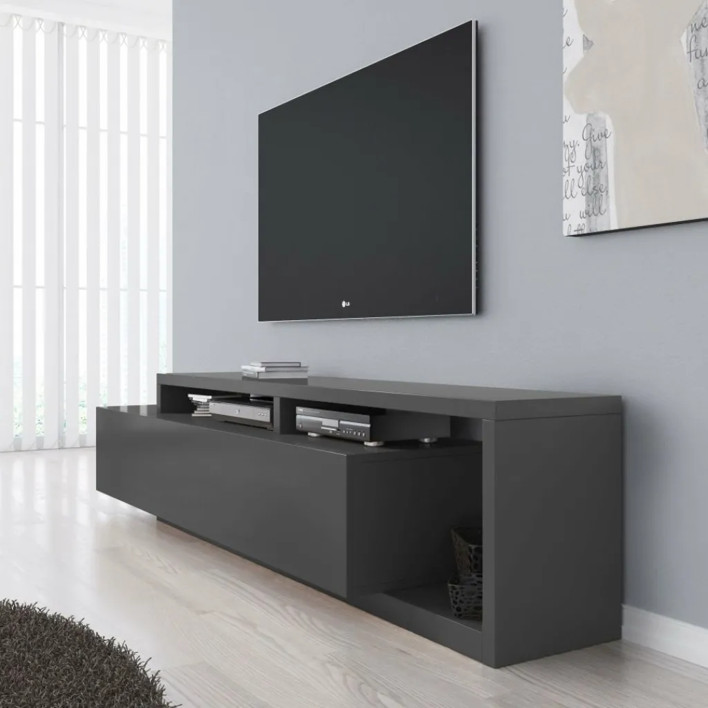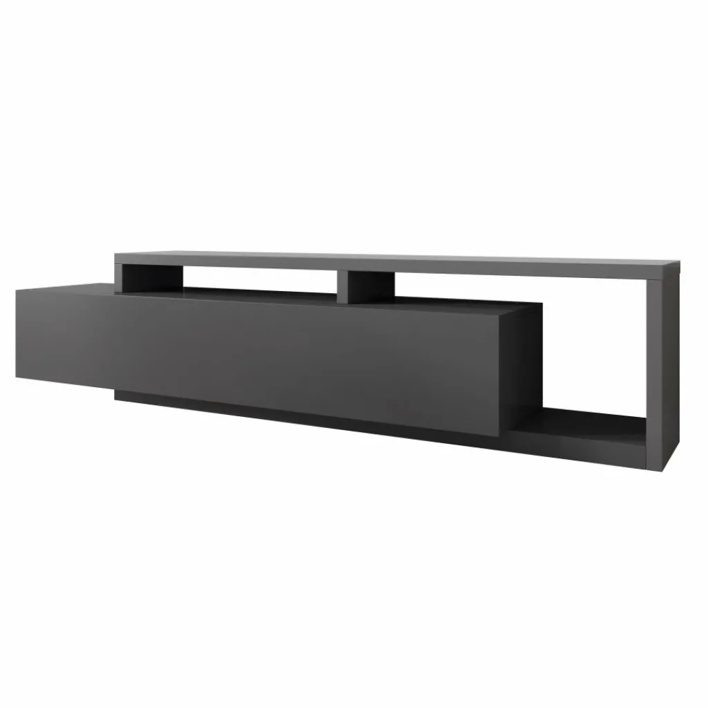 TV-Meubel Bello is een origineel vormgegeven kast geheel afgewerkt in antraciet. De kast is voorzien van een grote lade met daarachter voldoende opbergruimte. Boven op de lade en ernaast bevindt zich eveneens plek om apparatuur en andere spullen te plaatsen.