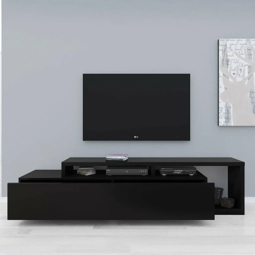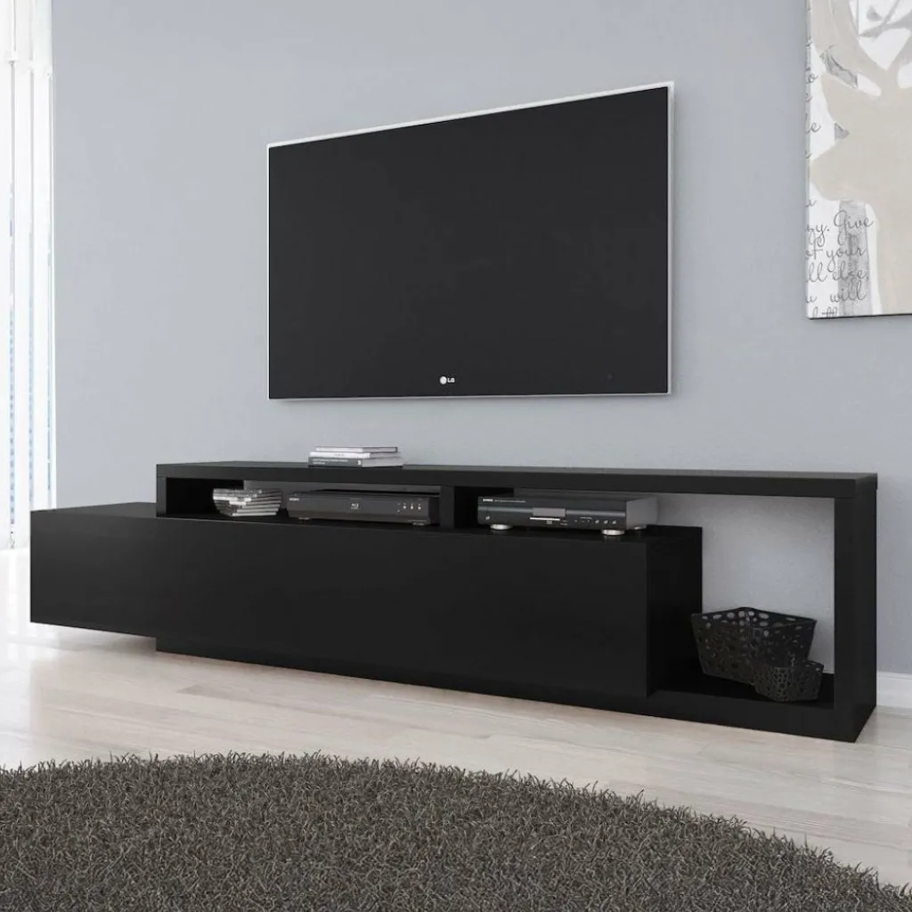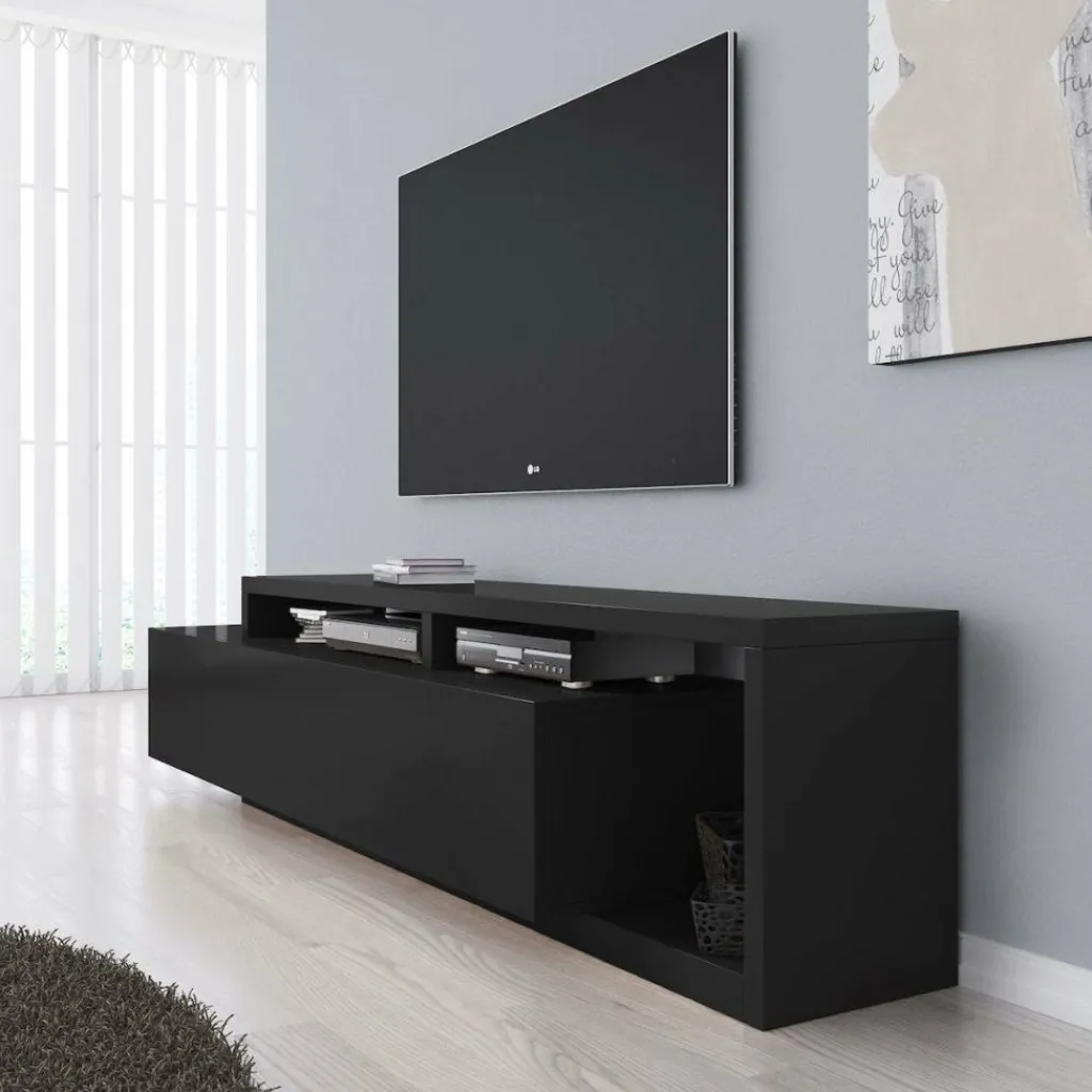 TV-Meubel Bello is een strak vormgegeven kast geheel uitgevoerd in de kleur mat zwart. De kast is voorzien van één grote lade waarachter zich twee opbergvakken bevinden. Boven op de lade en ernaast bevindt zich eveneens plek om apparatuur en andere spullen te plaatsen.