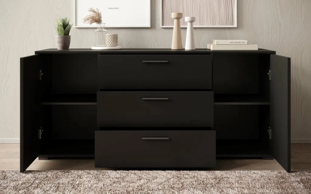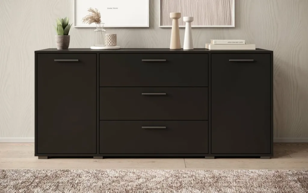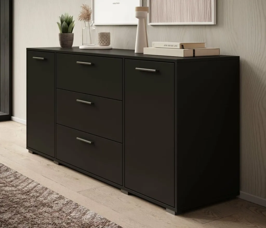 Dressoir Bonzo is een moderne designkast, uitgevoerd in een mat zwarte kleur. De kast beschikt over 2 deuren waarachter in totaal 4 opbergvakken zitten en 3 handige opberglades. De deuren en lades openen met zilverkleurige handgrepen. Door het strakke en eenvoudige design is dit meubel vooral passend binnen een moderne woonstijl.