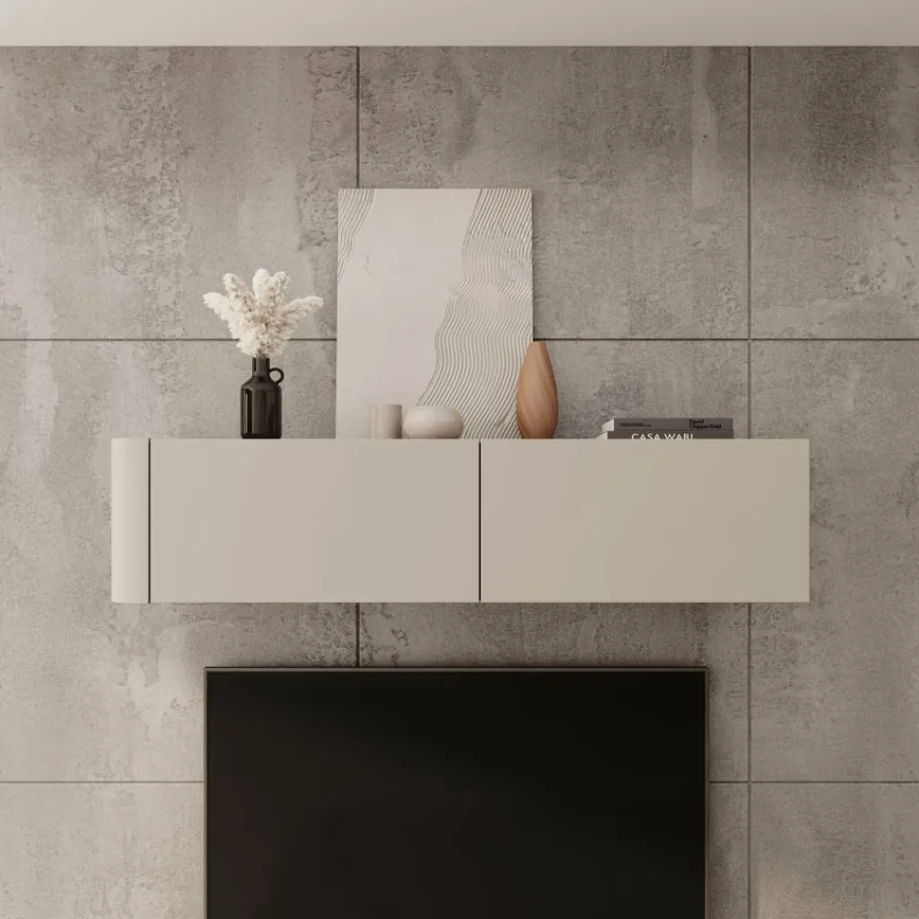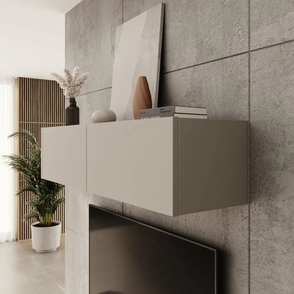 De beige afwerking geeft de wandkast een neutrale en moderne uitstraling die goed te combineren is met verschillende interieurstijlen. Bijou is een praktische wandoplossing voor boven een tv of als losse kast.