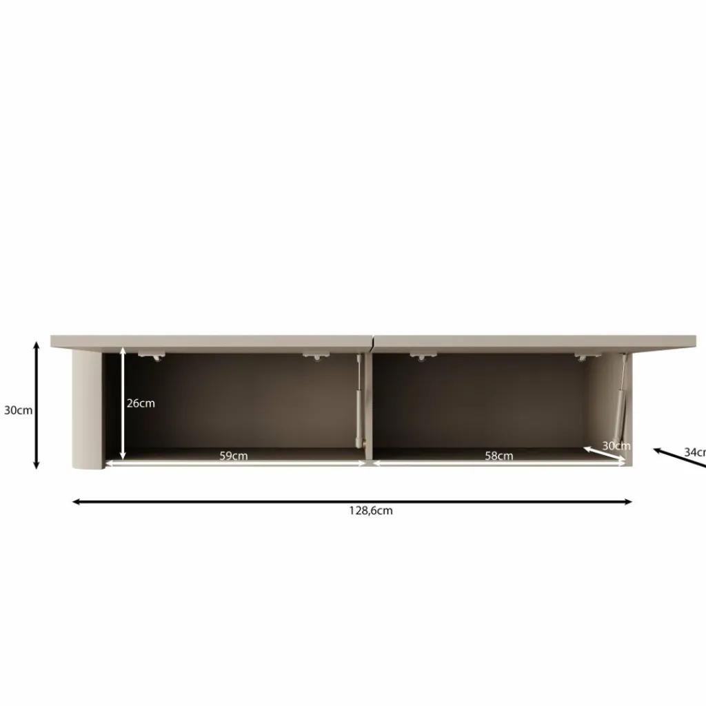De wandkast Bijou is uitgevoerd in beige en heeft een afmeting van 129 × 34 × 30 cm. Het meubel is bedoeld voor wandmontage en neemt daardoor geen vloeroppervlak in, wat zorgt voor een strakke en opgeruimde uitstraling in de woonkamer.
