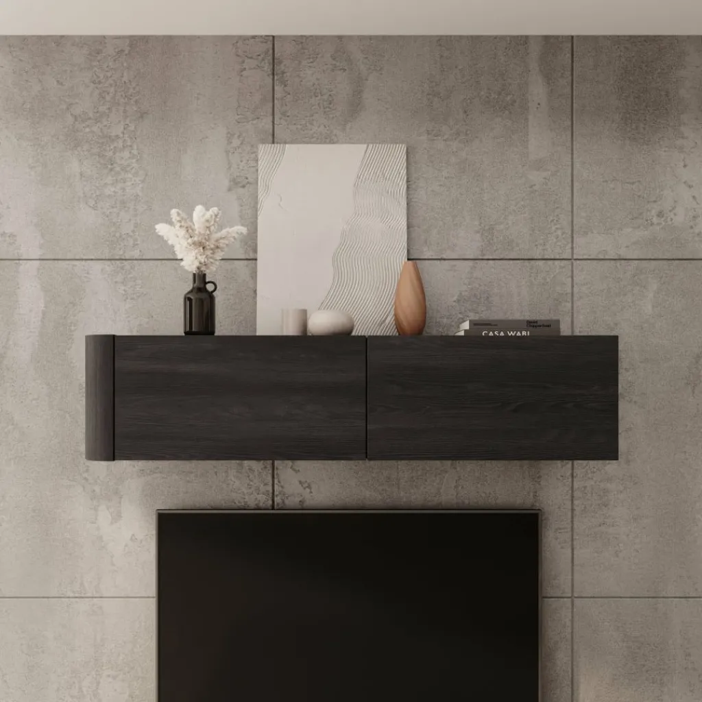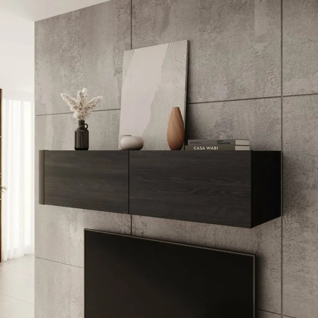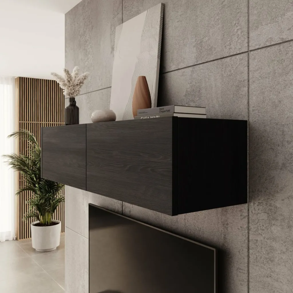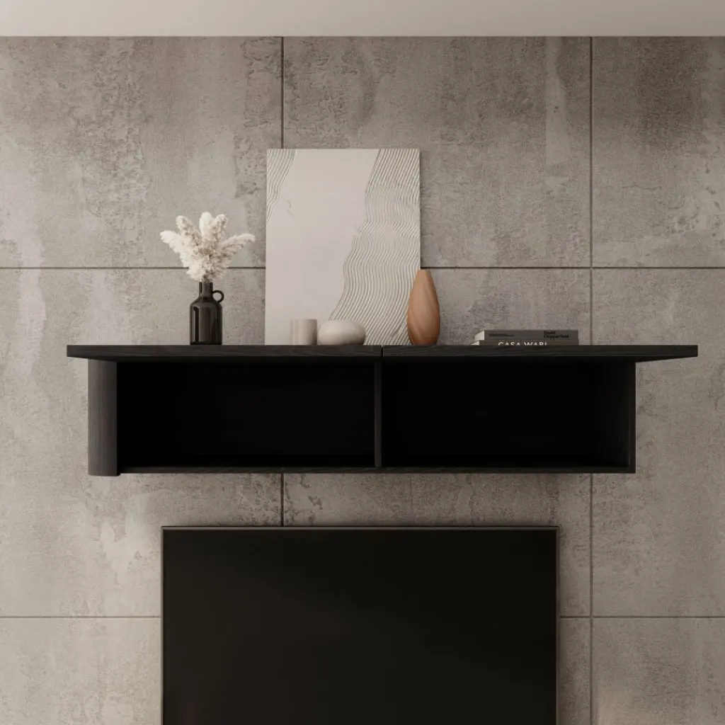De zwarte afwerking geeft Bijou een moderne en duidelijke uitstraling die goed past in verschillende interieurstijlen. De wandkast is geschikt voor plaatsing boven een tv of als los wandmeubel en vormt een praktische oplossing voor extra opbergruimte aan de muur.
