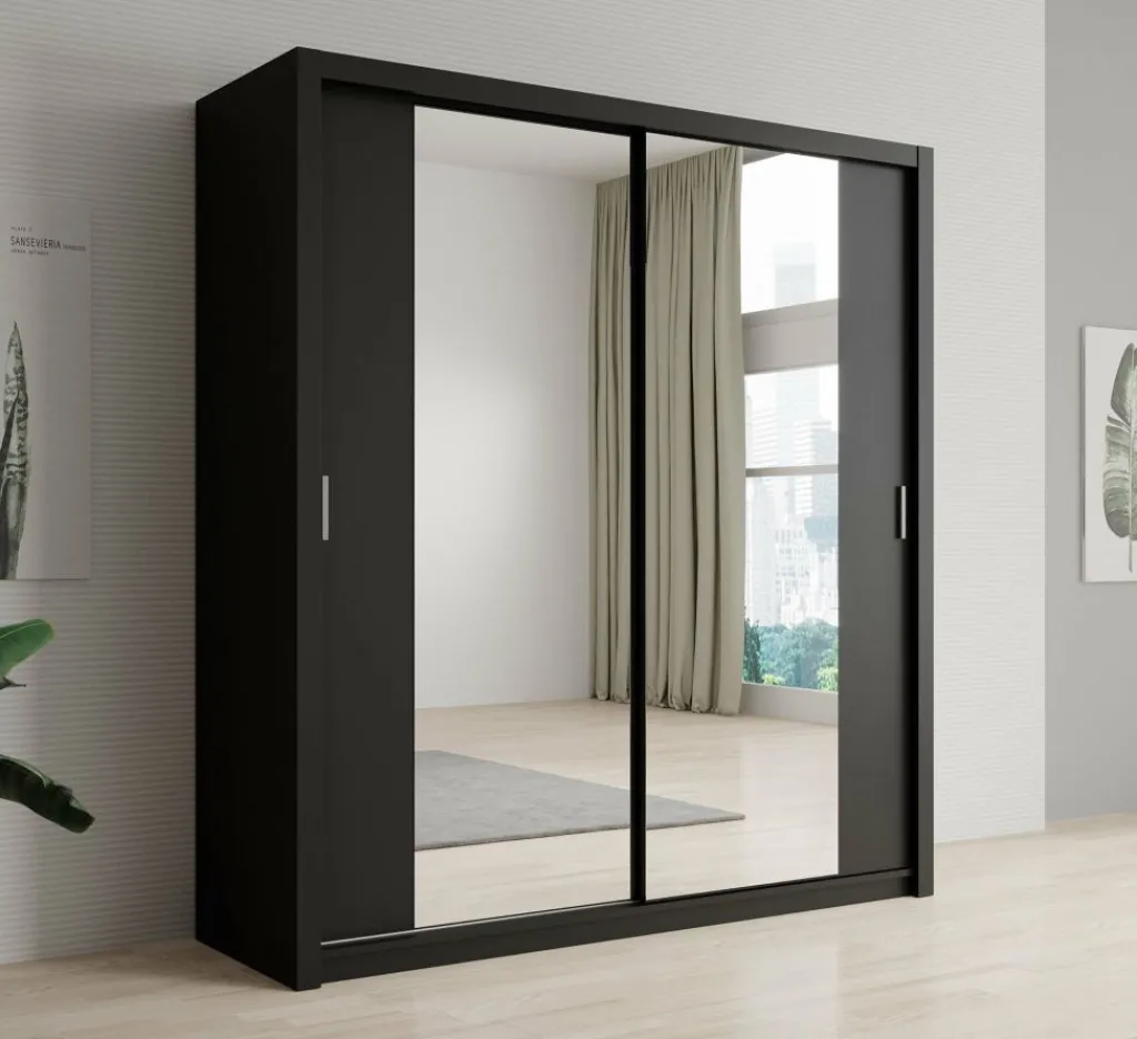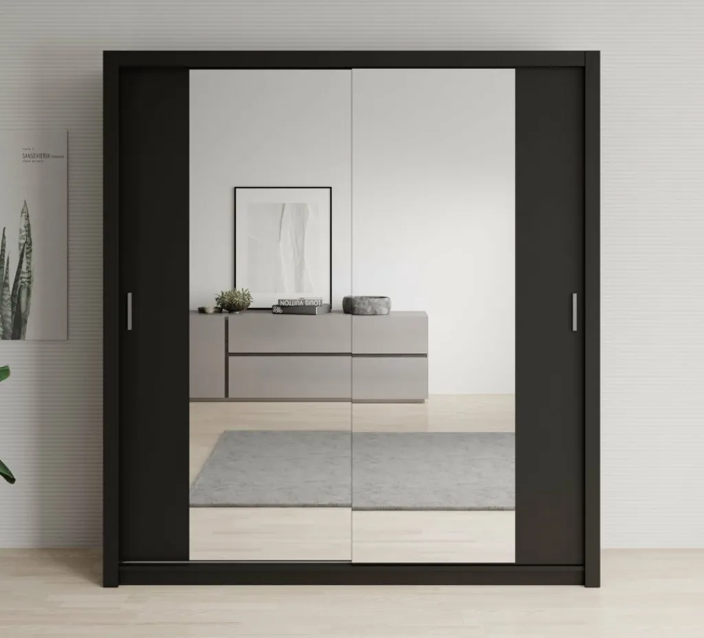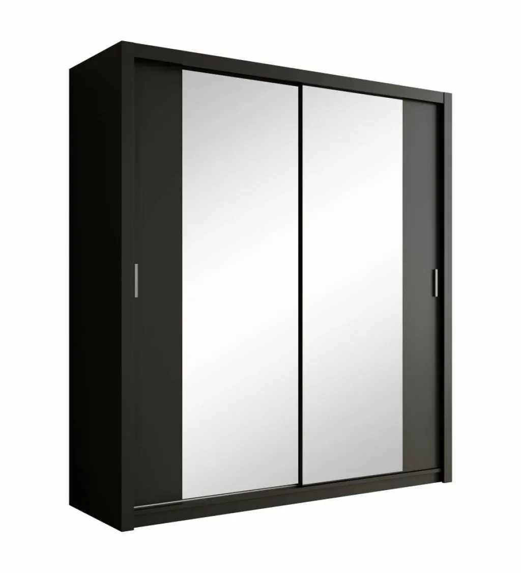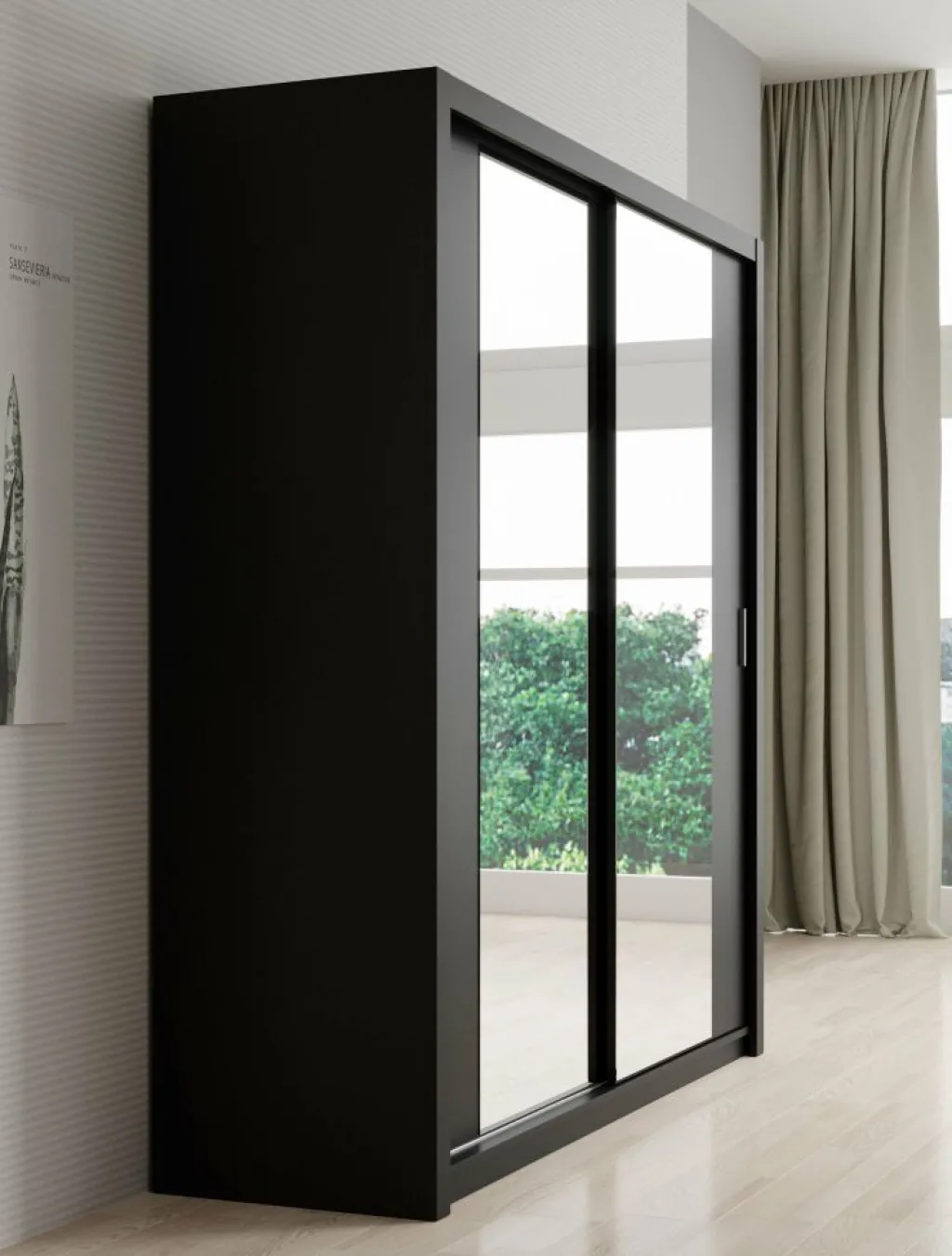 Kledingkast Blake is een moderne garderobekast uitgevoerd in mat zwart. De kledingkast heeft twee schuifdeuren met daarachter veel opbergruimte. Op beide deuren zit een grote spiegel. In de binnenkant van de kast vind je 12 opbergvakken. Daarnaast beschikt de kast over een stang om kleding op te hangen.