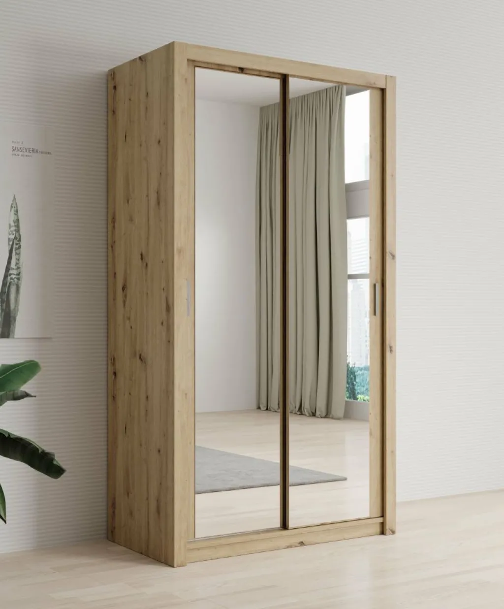 Kledingkast Blake is een moderne garderobekast uitgevoerd in eiken kleur. De kledingkast heeft twee schuifdeuren met daarachter veel opbergruimte. In de binnenkant van de kast vind je 6 opbergvakken. Daarnaast beschikt de kast over twee stangen om kleding op te hangen.