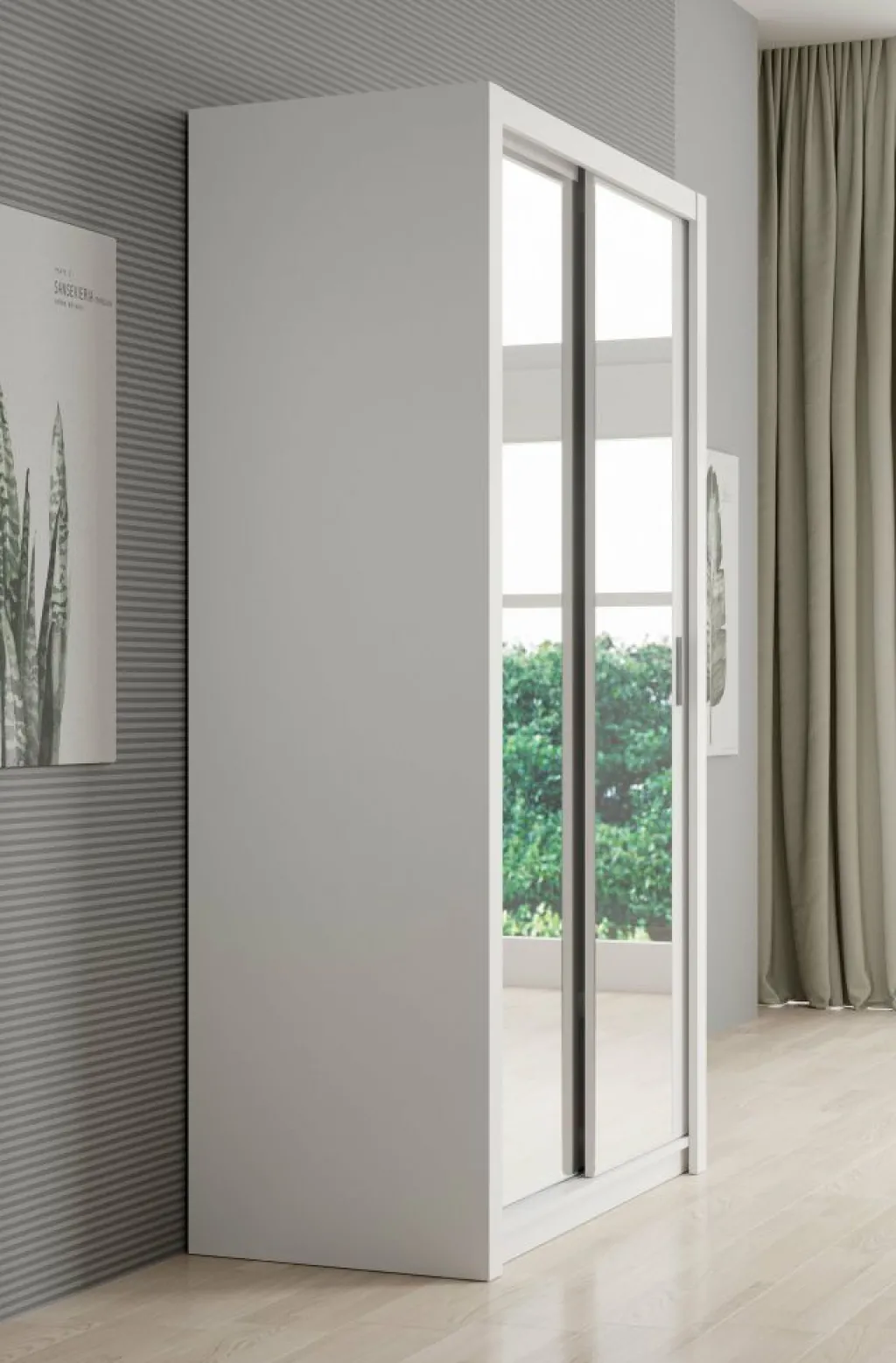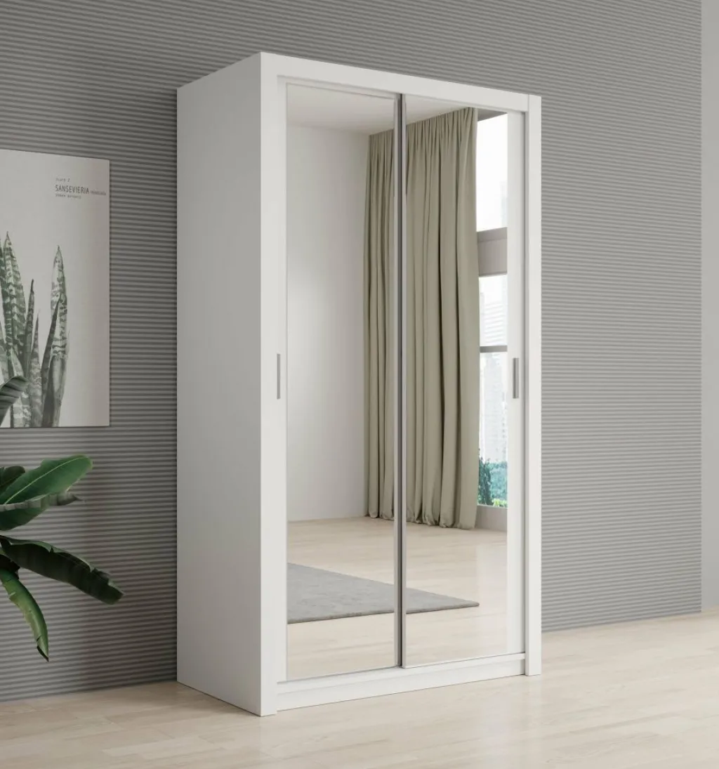 Kledingkast Blake is een moderne garderobekast uitgevoerd in mat witte kleur. De kledingkast heeft twee schuifdeuren met daarachter veel opbergruimte. In de binnenkant van de kast vind je 6 opbergvakken. Daarnaast beschikt de kast over twee stangen om kleding op te hangen.