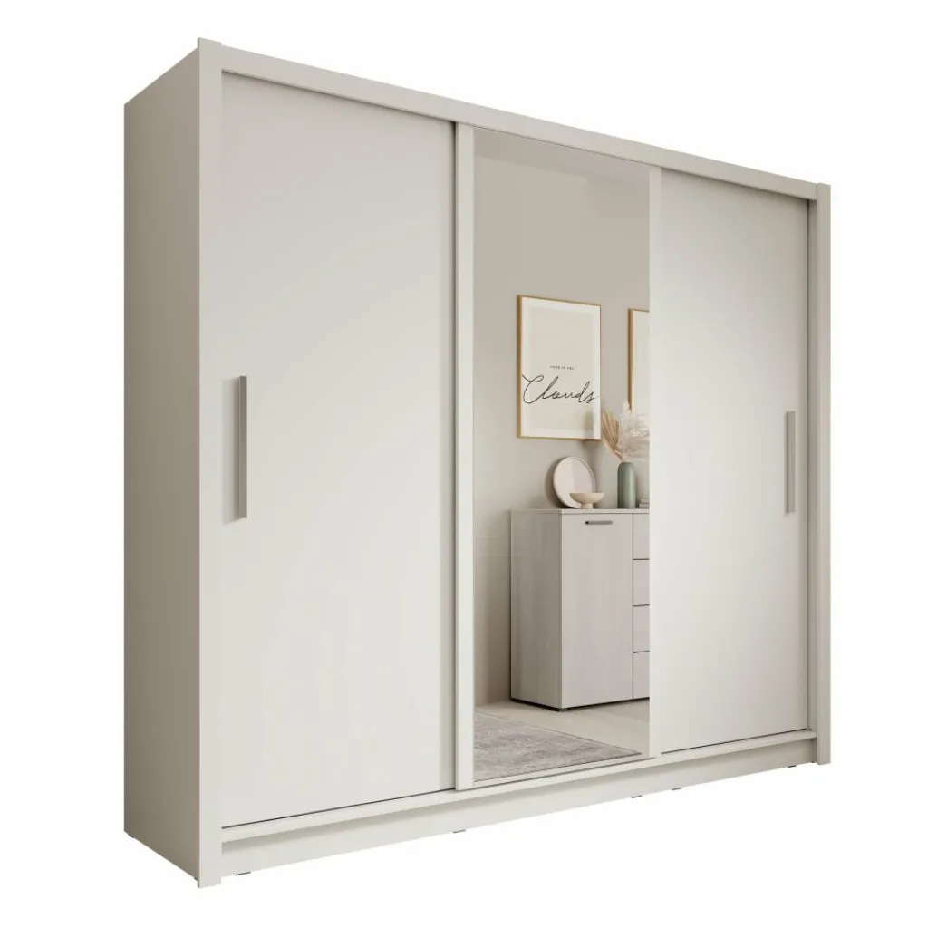 De Blue kledingkast in wit biedt royale opbergruimte en een tijdloze uitstraling die perfect past in elke slaapkamer. De kast beschikt over drie brede schuifdeuren, waarvan één met een grote spiegel. Deze spiegeldeur zorgt voor extra gemak tijdens het aankleden en laat de kamer optisch groter en lichter aanvoelen.