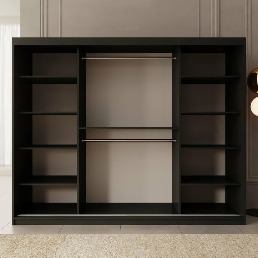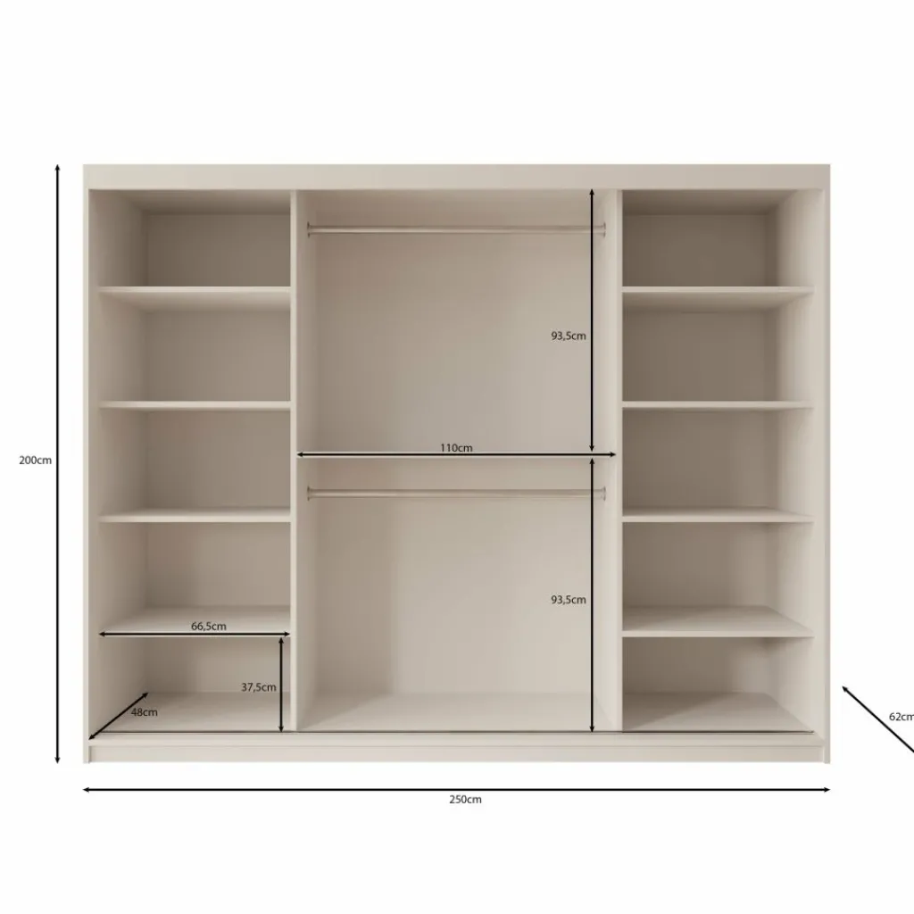 Met een royale breedte van 250 cm is dit de grootste variant van de Bodhi kledingkast. Achter de schuifdeuren bevindt zich een ruime indeling met meerdere legplanken en dubbele hanggedeeltes, zodat je volledige garderobe overzichtelijk kan worden opgeborgen.