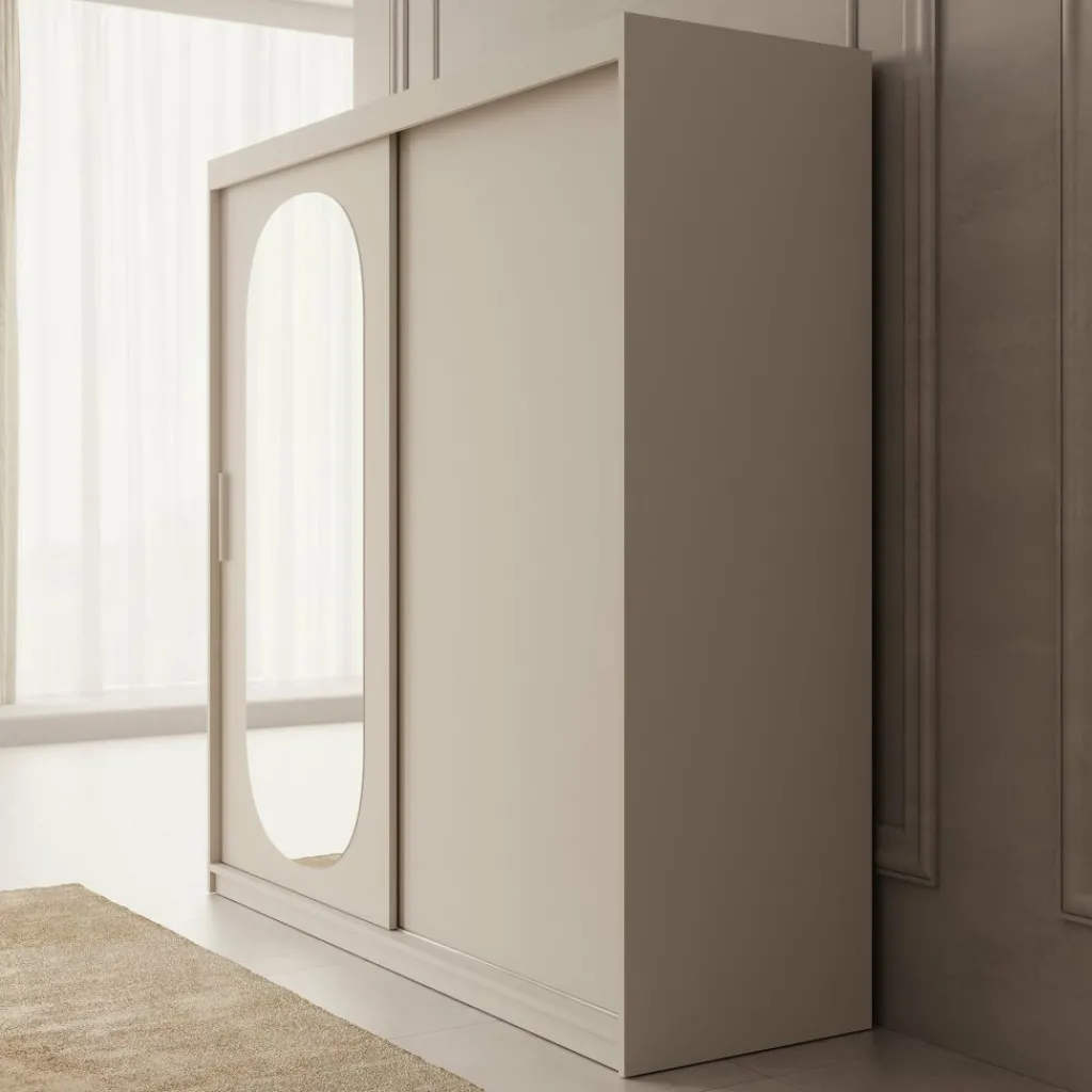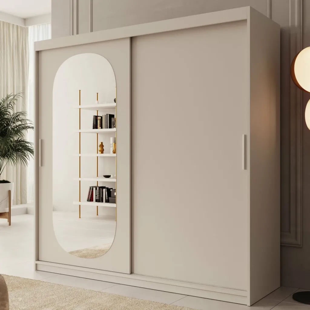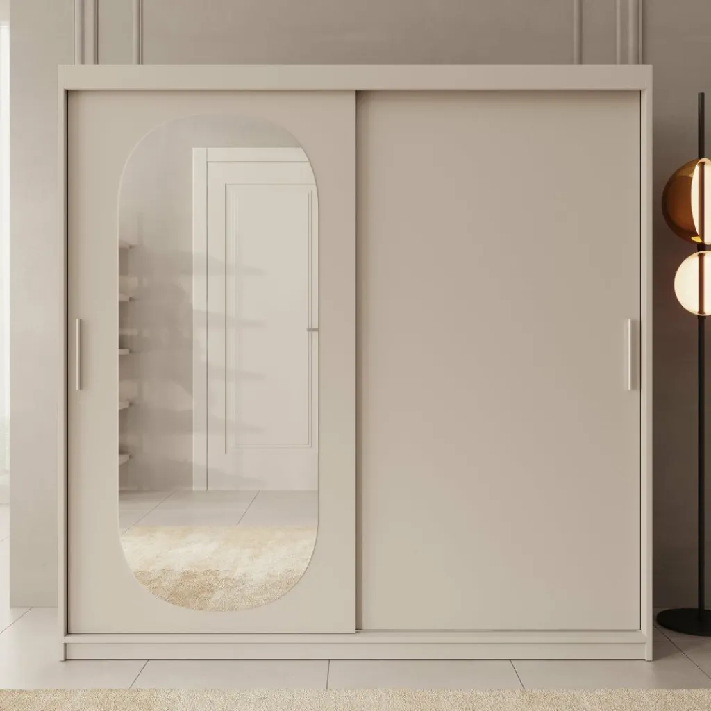 De beige kleur geeft de kast een tijdloze, neutrale uitstraling, terwijl de spiegeldeur bijdraagt aan een luxueuze en ruimtelijke look. Perfect voor middelgrote tot grotere slaapkamers waar zowel stijl als functionaliteit belangrijk zijn.