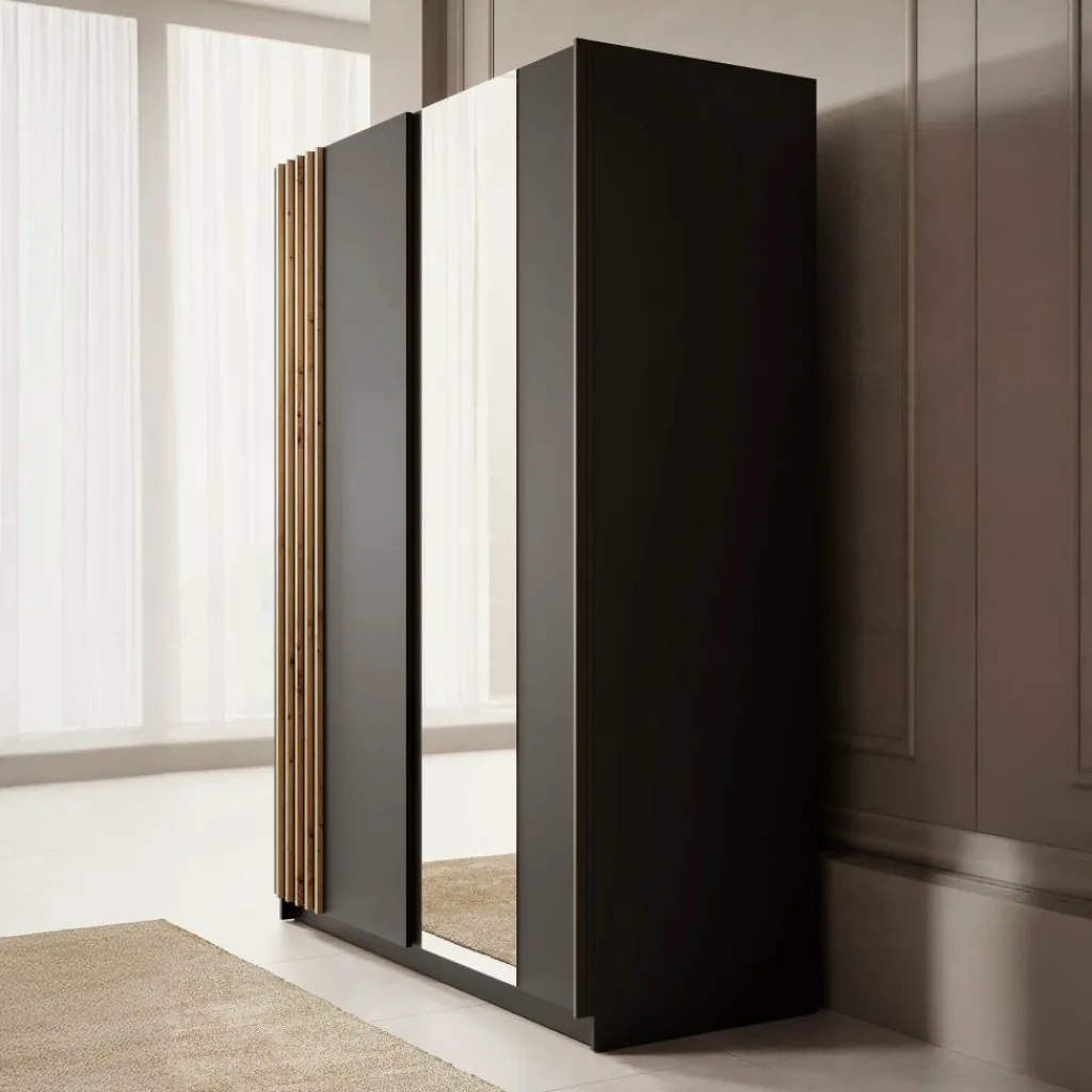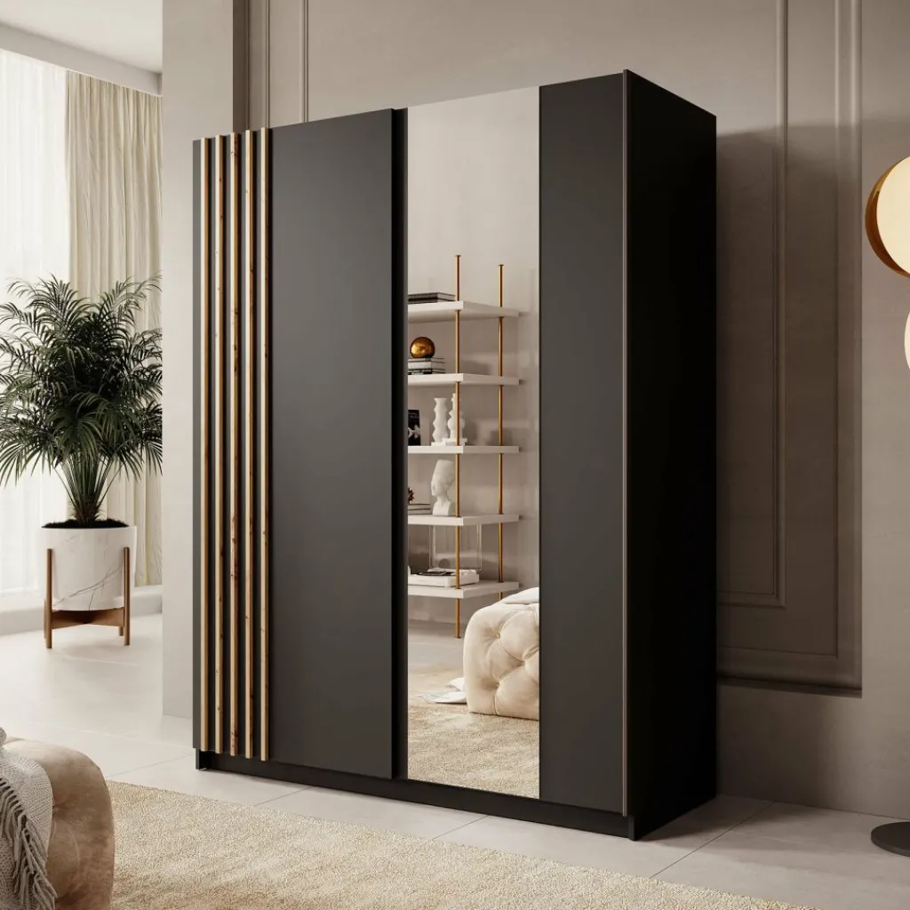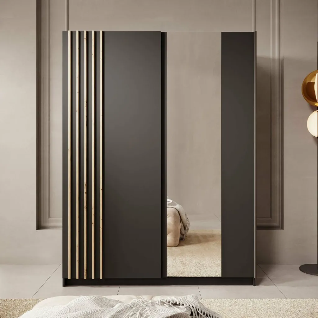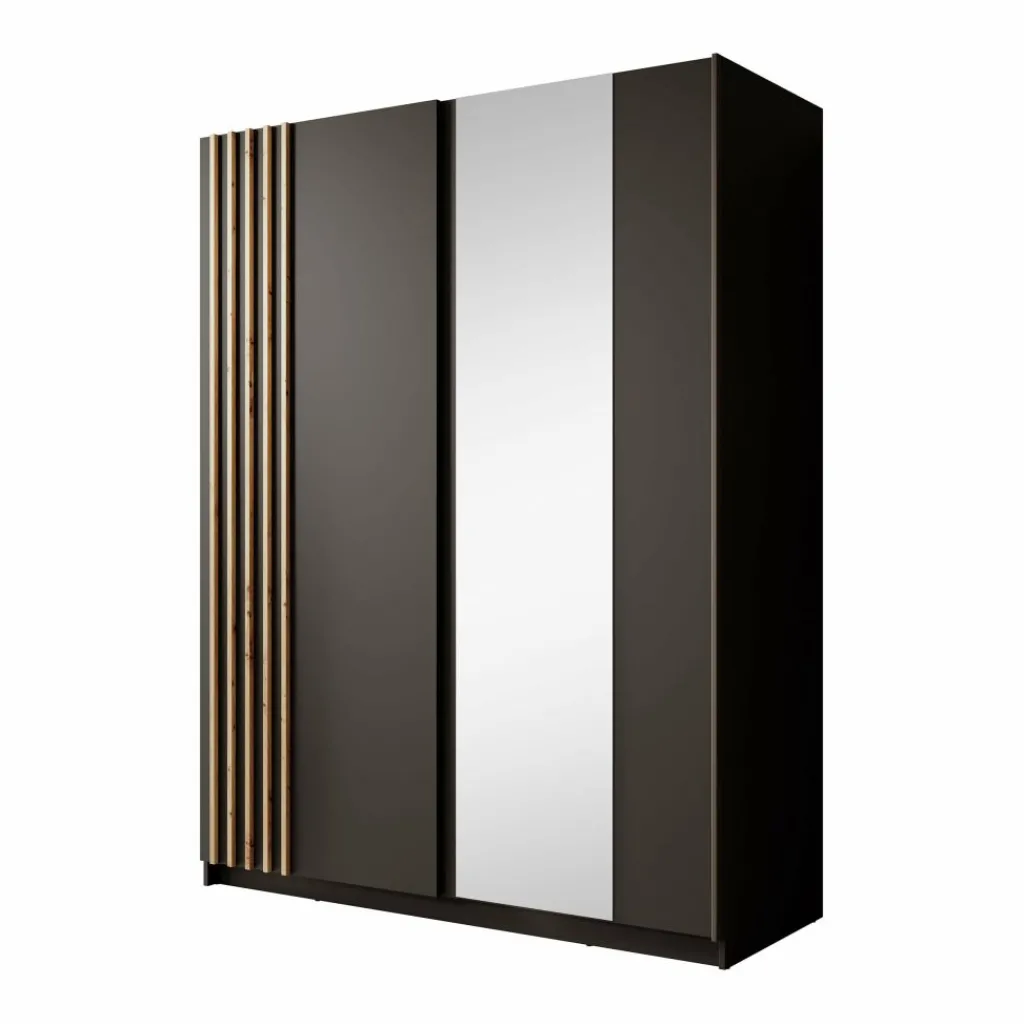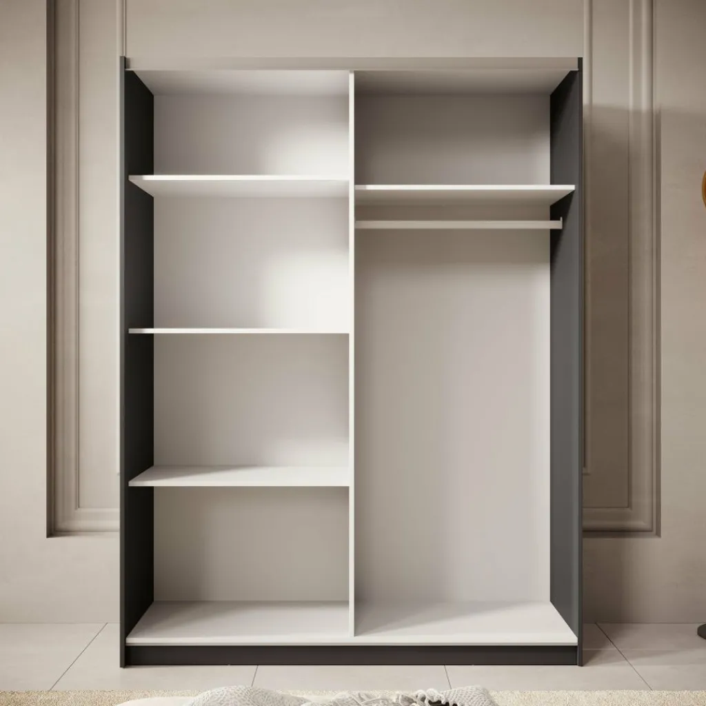 Kledingkast Boets is een garderobekast met ruime opbergmogelijkheden. Dit model is voorzien van 2 schuifdeuren. Op de linkerdeur bevinden zich houten latjes en op de rechterdeur bevindt zich een grote spiegel. De binnenkant bestaat uit 5 opbergvakken en 1 kledingroede.