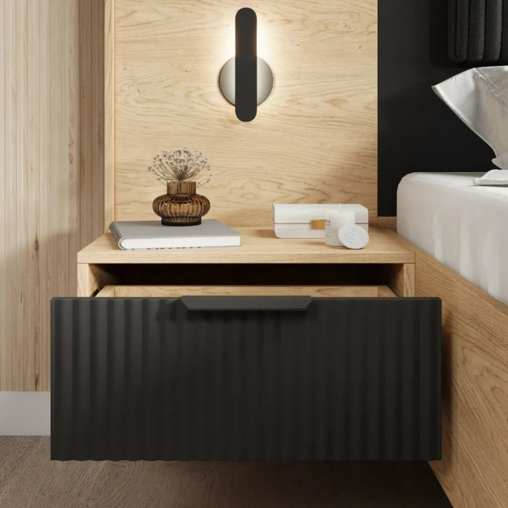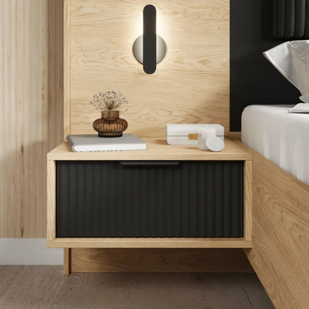 Deze stijlvolle nachtkastjes uit de Bogota-serie zijn ontworpen als perfecte aanvulling op het bijpassende tweepersoonsbed. De set bestaat uit twee identieke kastjes: één voor links en één voor rechts van het bed. De combinatie van eikenhoutdecor met een zwarte frontlade zorgt voor een moderne, warme uitstraling.