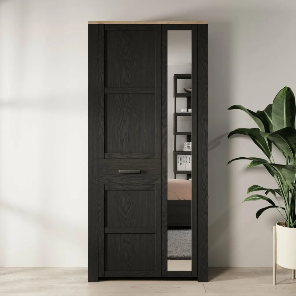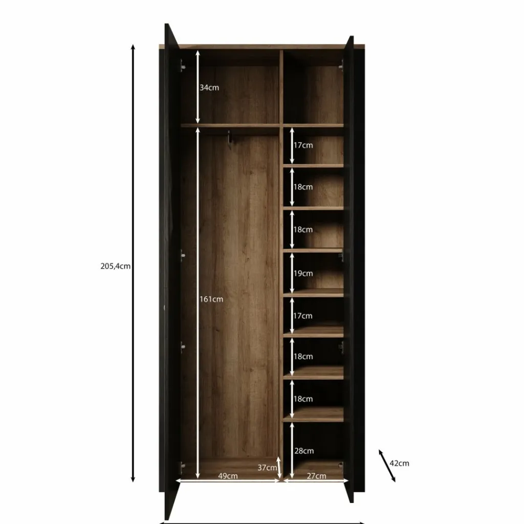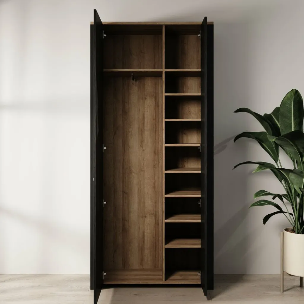 De kast is uitgevoerd in zwart met een eikenlook binnenzijde en opgebouwd uit gelamineerd spaanplaat. Achter de deuren is de indeling functioneel opgezet: aan één zijde bevindt zich een hanggedeelte met roede voor jassen, jurken of overhemden, terwijl de andere zijde is voorzien van meerdere vaste legplanken voor gevouwen kleding, schoenen of accessoires. Deze combinatie maakt de kast geschikt voor uiteenlopende opbergbehoeften.