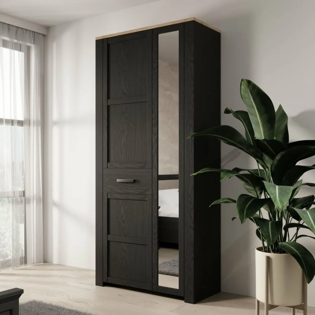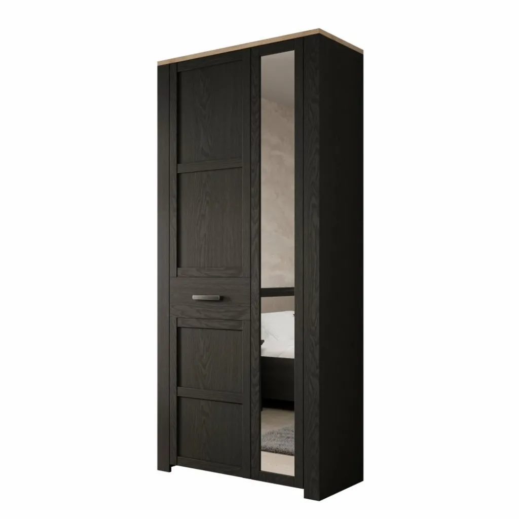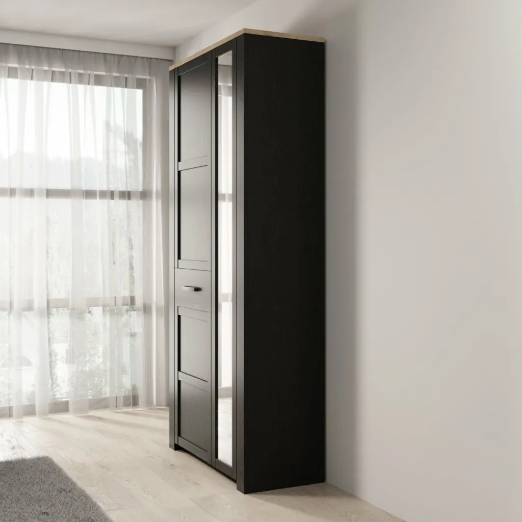 De kast is uitgevoerd in zwart met een eikenlook binnenzijde en opgebouwd uit gelamineerd spaanplaat. Achter de deuren is de indeling functioneel opgezet: aan één zijde bevindt zich een hanggedeelte met roede voor jassen, jurken of overhemden, terwijl de andere zijde is voorzien van meerdere vaste legplanken voor gevouwen kleding, schoenen of accessoires. Deze combinatie maakt de kast geschikt voor uiteenlopende opbergbehoeften.
