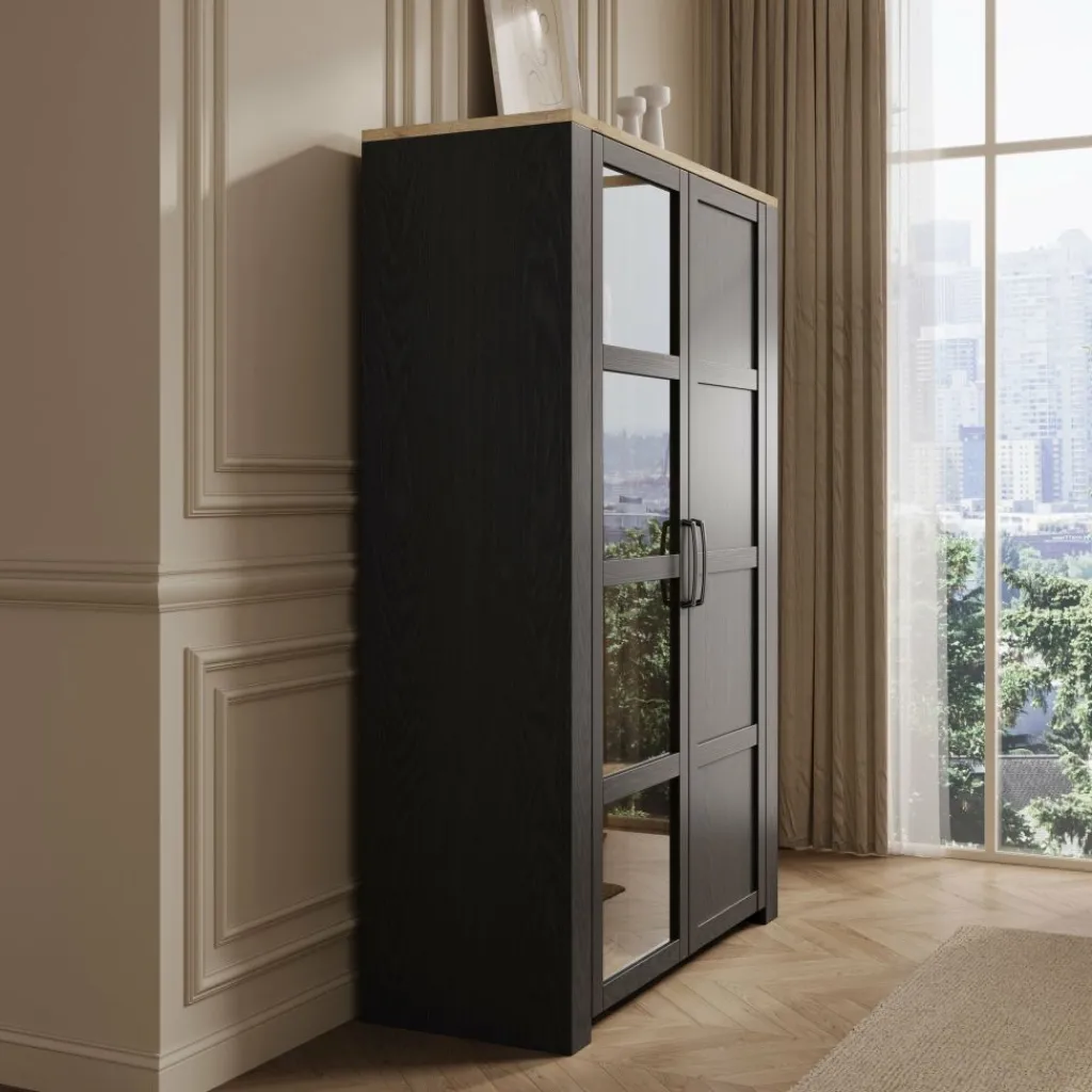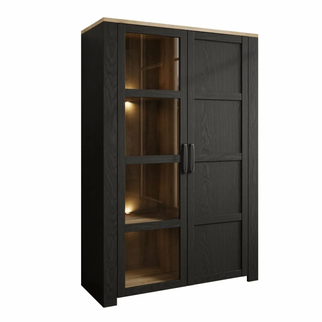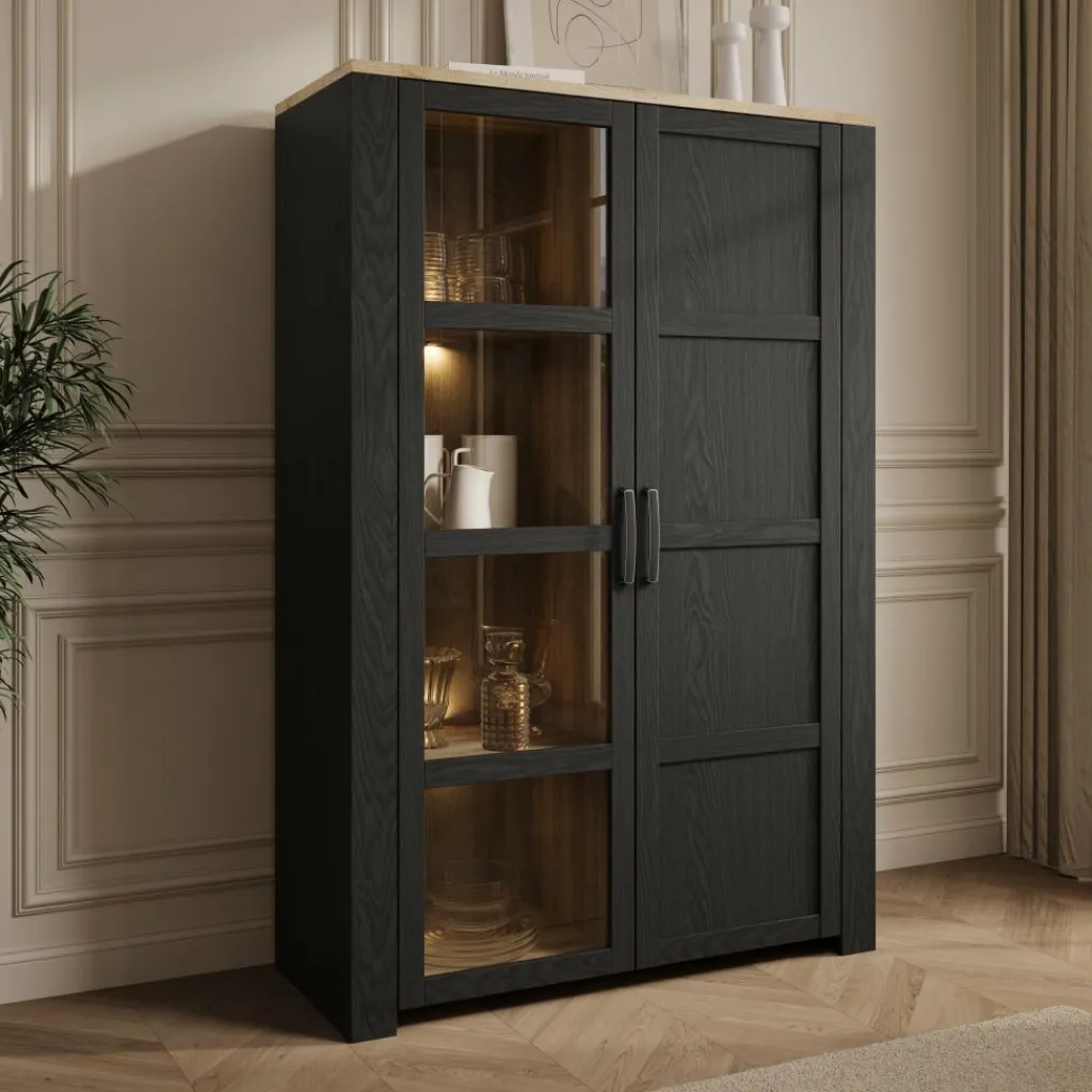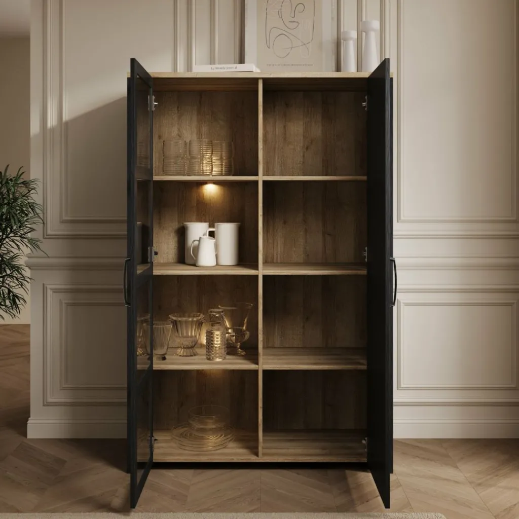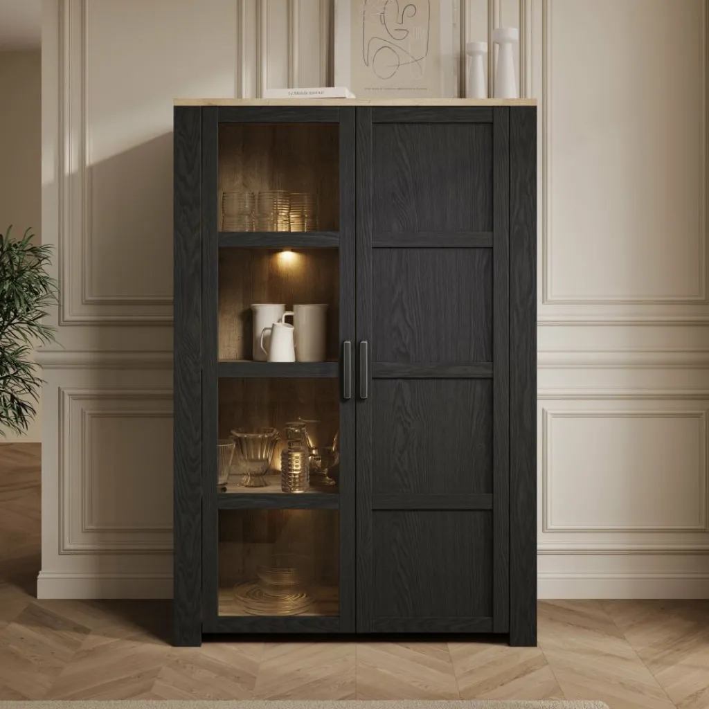 De kast beschikt over twee deuren en meerdere vaste legplanken, waardoor servies, glaswerk en andere spullen overzichtelijk kunnen worden opgeborgen. De combinatie van open en gesloten delen zorgt voor een goede balans tussen opbergen en presenteren. De zwart eikenlook afwerking geeft de kast een strak geheel, terwijl de eikenlook binnenzijde zorgt voor een duidelijk contrast en goed zicht op de inhoud.