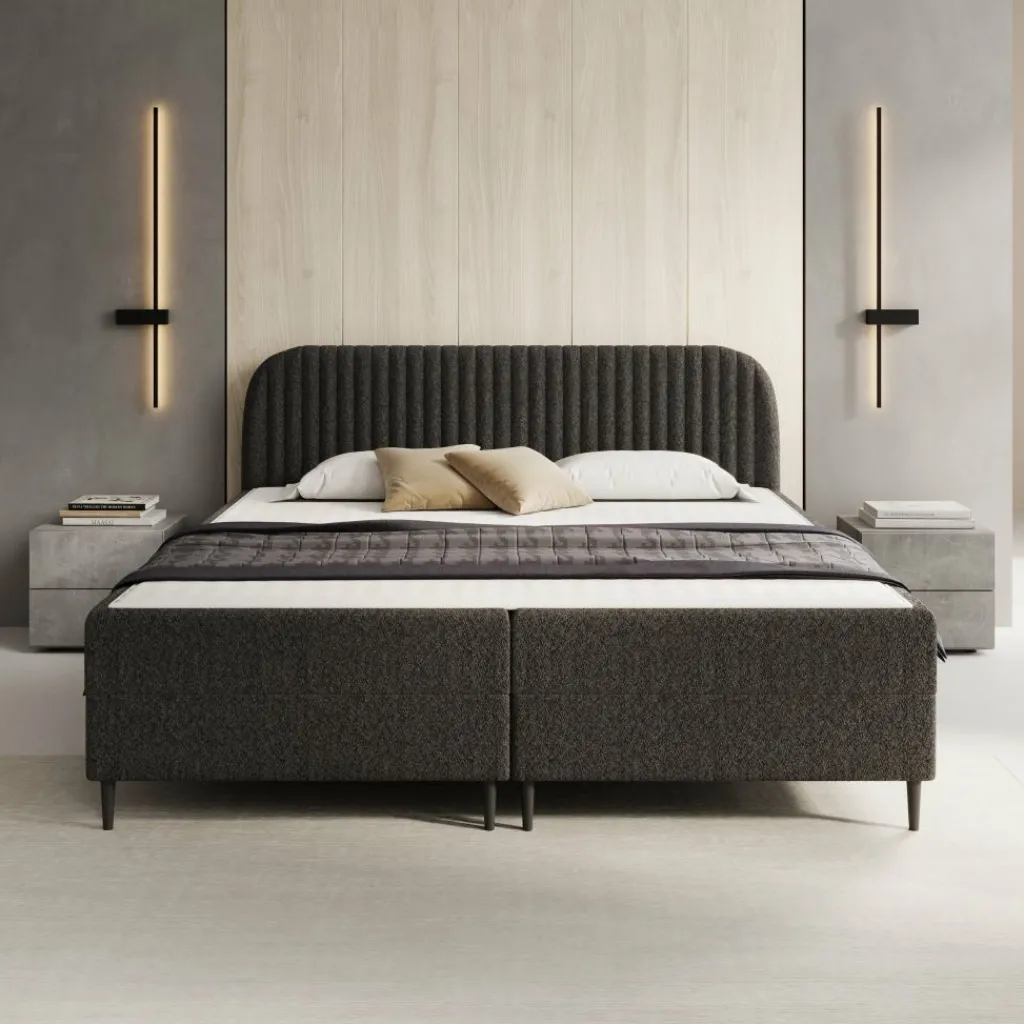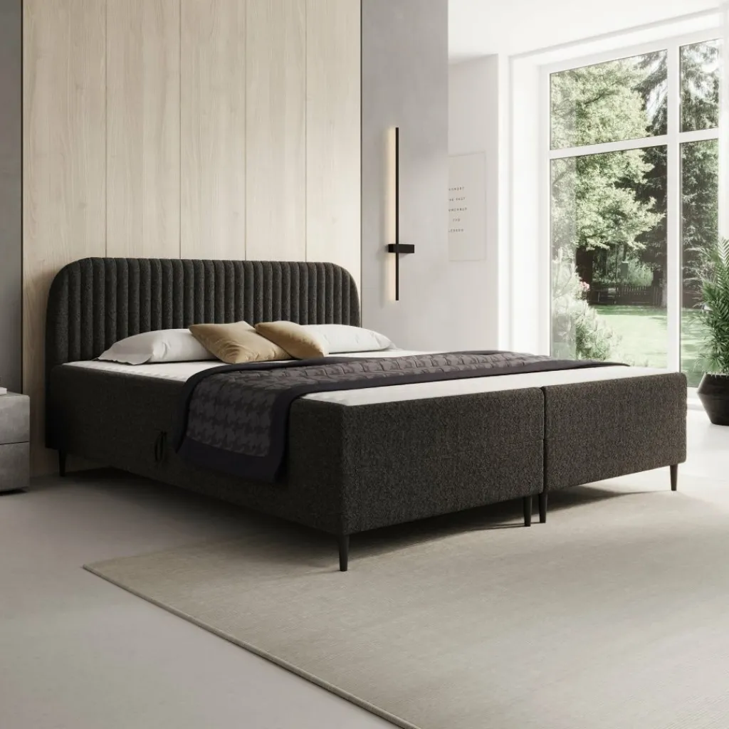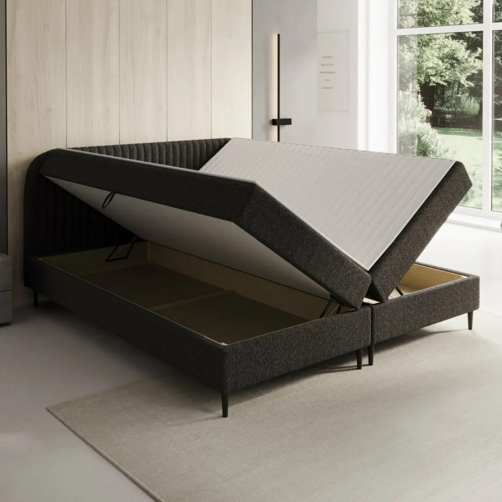 De Bosque boxspring in 180×200 cm combineert een royale slaapruimte met praktische opbergmogelijkheden. De teddystof in zwart zorgt voor een rustige uitstraling, terwijl het frame is opgebouwd uit 16 mm meubelplaat en hout voor een stevige basis. Het hoofdbord bevat 2 cm T25-schuim voor extra comfort.