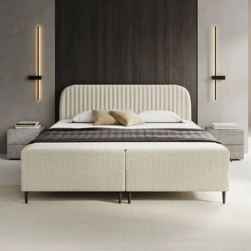 De Bosque boxspring in 180×200 cm is een ruime en praktisch ingerichte slaapoplossing met geïntegreerde opbergruimte. Het model is bekleed met beige teddystof en opgebouwd uit een stevig frame van 16 mm meubelplaat en hout. Het hoofdbord is voorzien van 2 cm T25-schuim voor extra comfort tijdens het zitten.