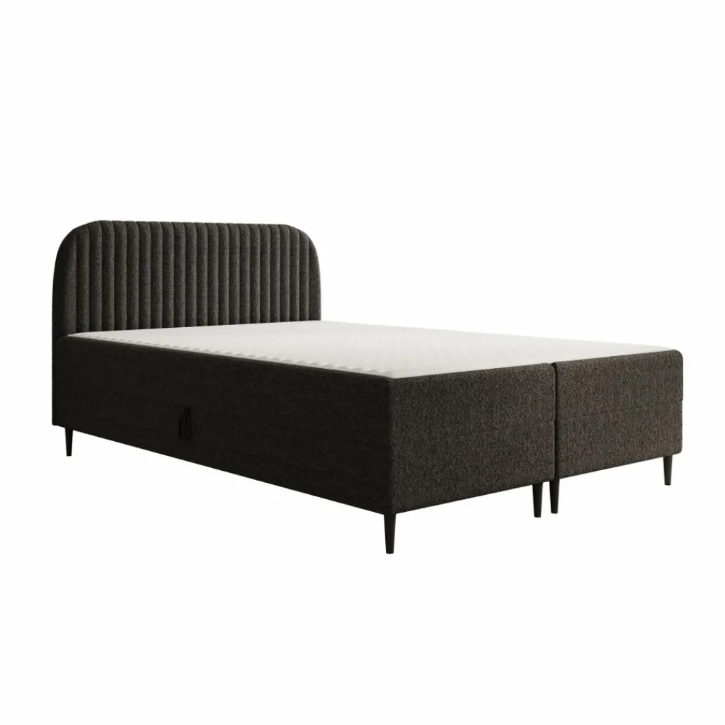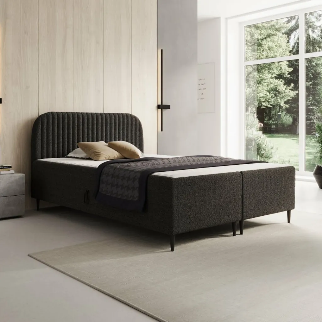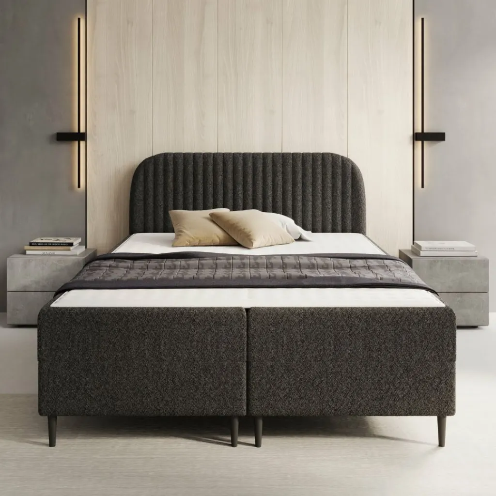 De Bosque boxspring is een praktische slaapoplossing met geïntegreerde opbergruimte en een zachte teddystof bekleding in zwart. Het bed is opgebouwd uit een stevig frame van 16 mm meubelplaat en hout. Het hoofdbord is eveneens uitgevoerd in meubelplaat, afgewerkt met 2 cm T25-schuim voor een comfortabele rugleuning.