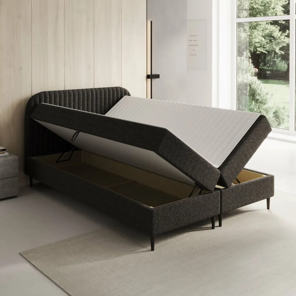 Aan beide zijden van het bed bevinden zich opbergvakken voor bijvoorbeeld beddengoed. Elk opbergvak kan maximaal 10 kg gewicht dragen. Je opent de opbergruimte eenvoudig met een handige lus, waarbij de matrassen soepel omhoog komen dankzij de veringen. Dit maakt de Bosque boxspring geschikt voor slaapkamers waar extra opbergruimte gewenst is.