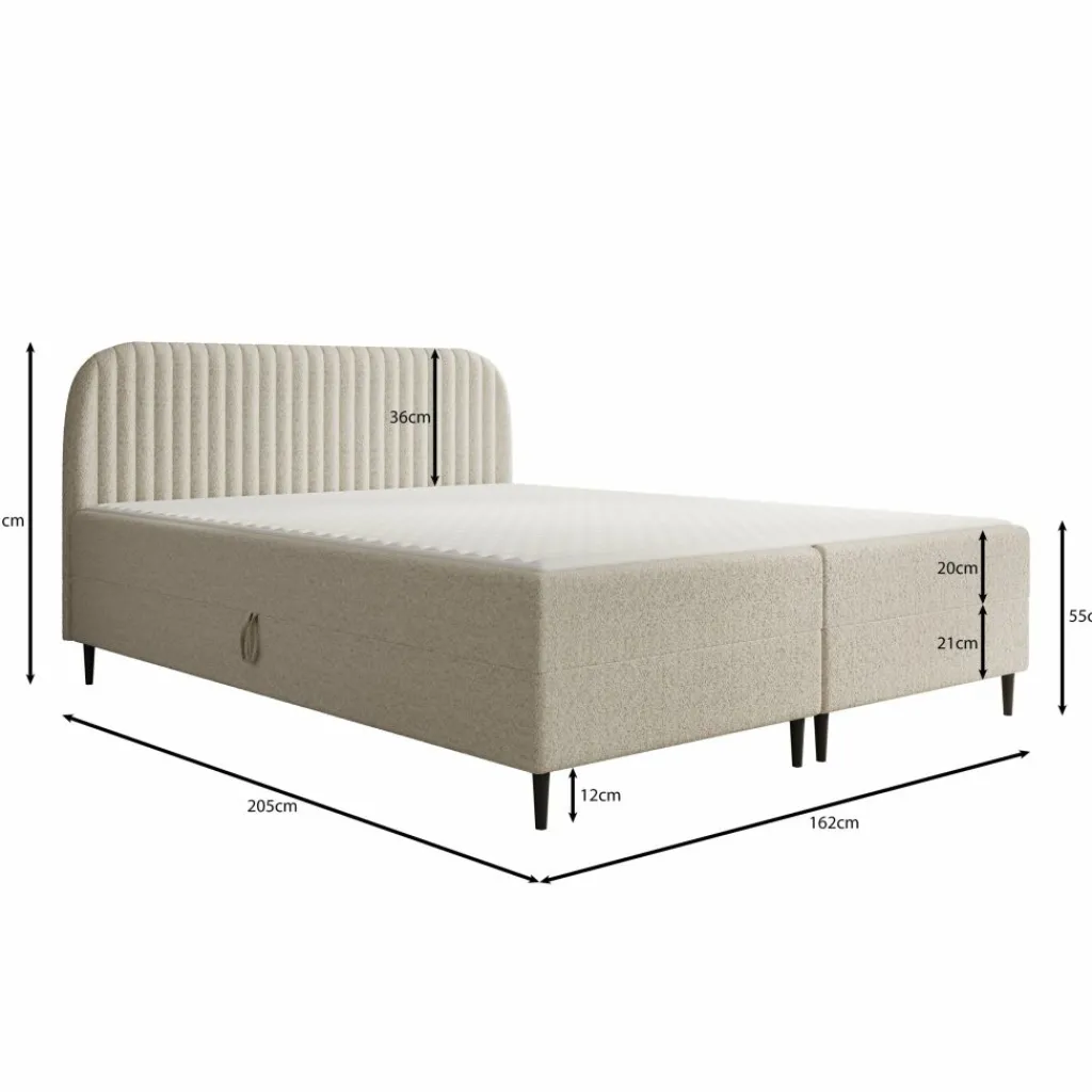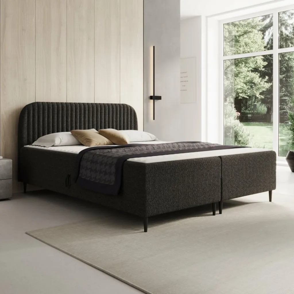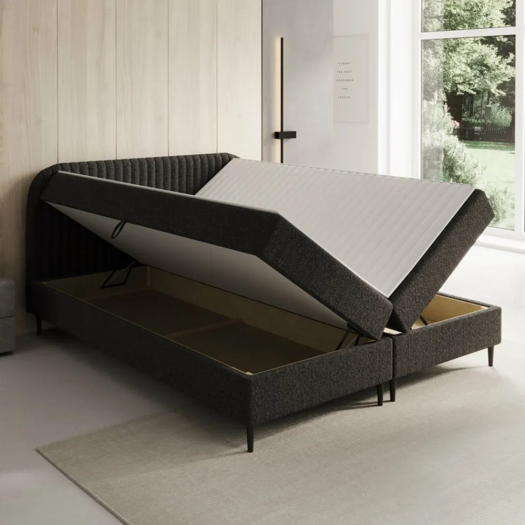 De Bosque boxspring biedt een combinatie van comfortabele ondersteuning en praktische opbergruimte. Het model is bekleed met zachte teddystof in zwart en is opgebouwd uit een stevig frame van 16 mm meubelplaat en hout. Het hoofdbord is voorzien van 2 cm T25-schuim, waardoor je prettig kunt zitten en leunen.