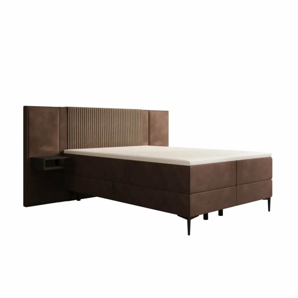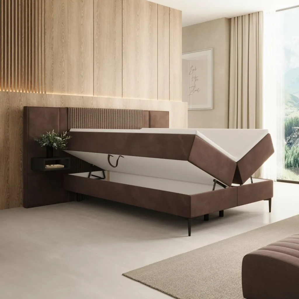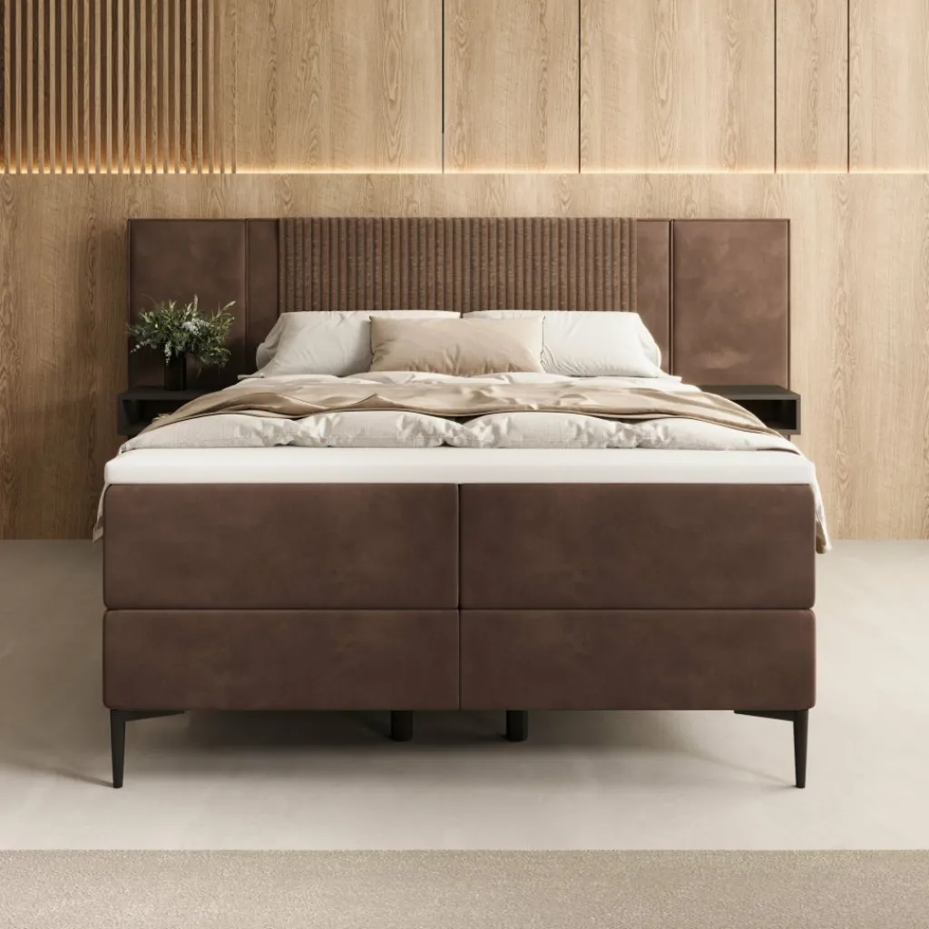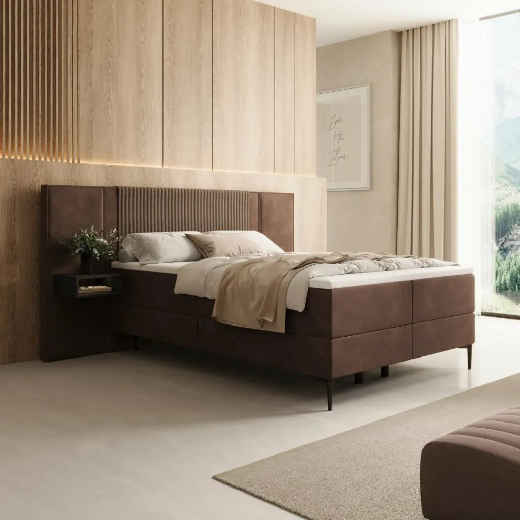 De Boyd boxspring in velvet bruin wordt geleverd in de maat 140×200 cm en heeft een matte afwerking. De twee zwevende nachtkastjes zijn direct aan het hoofdbord bevestigd, waardoor het geheel compact en strak oogt. De nachtkastjes zijn voorzien van geïntegreerde LED-verlichting, die zorgt voor een praktisch lichtpunt naast het bed. Het hoofdbord zelf is uitgevoerd met verticale banen en heeft geen verlichting. De velvet bekleding zorgt voor een gelijkmatige en verzorgde afwerking.