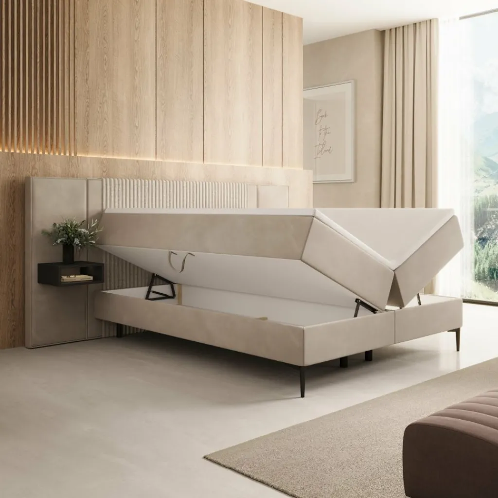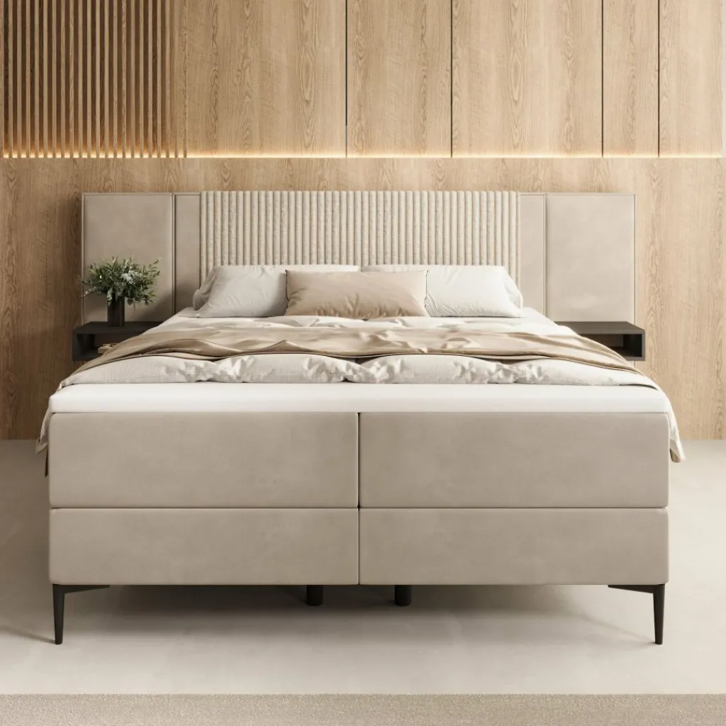 De Boyd boxspring in velvet beige wordt geleverd in de maat 160×200 cm en heeft een matte afwerking. De twee zwevende nachtkastjes zijn direct aan het hoofdbord bevestigd, waardoor het geheel compact en strak oogt. De nachtkastjes zijn voorzien van geïntegreerde LED-verlichting, die zorgt voor een praktisch lichtpunt naast het bed. Het hoofdbord zelf is uitgevoerd met verticale banen en heeft geen verlichting. De velvet bekleding zorgt voor een gelijkmatige en verzorgde afwerking.
