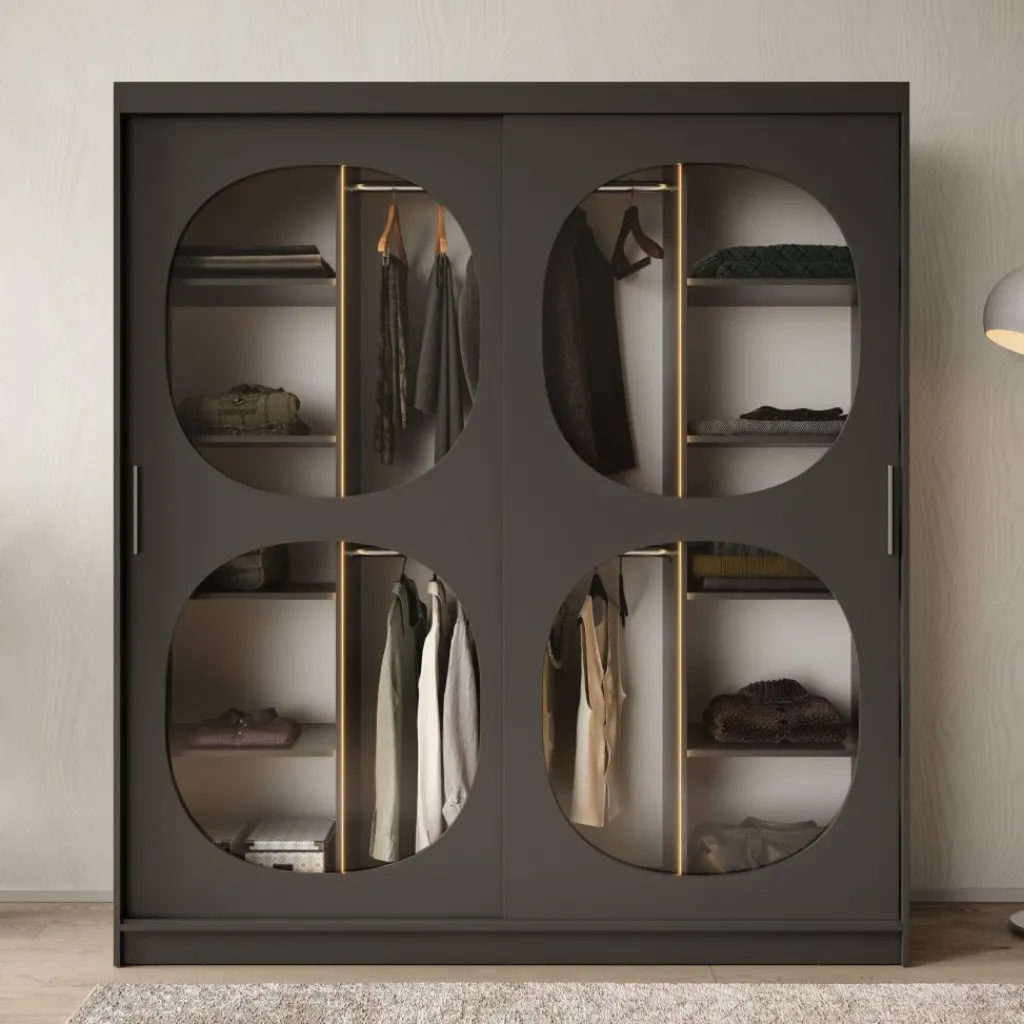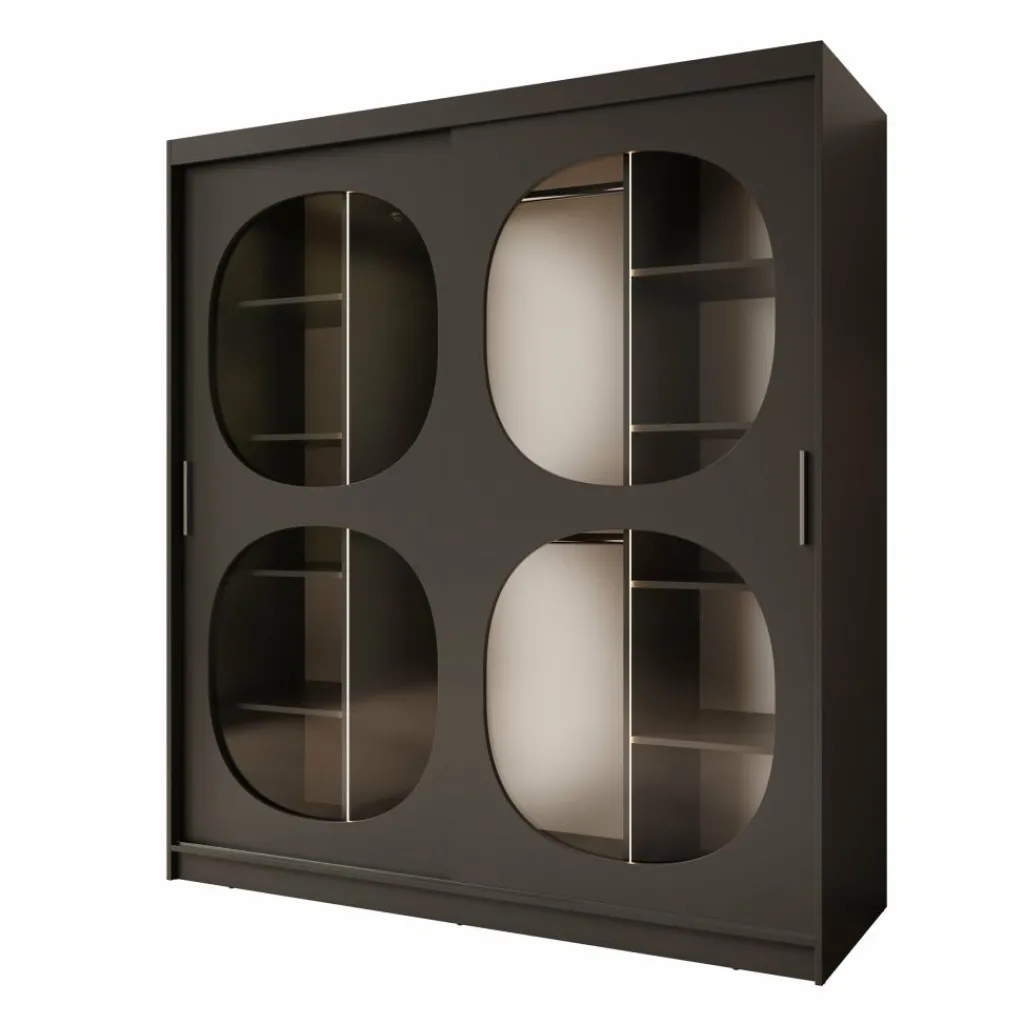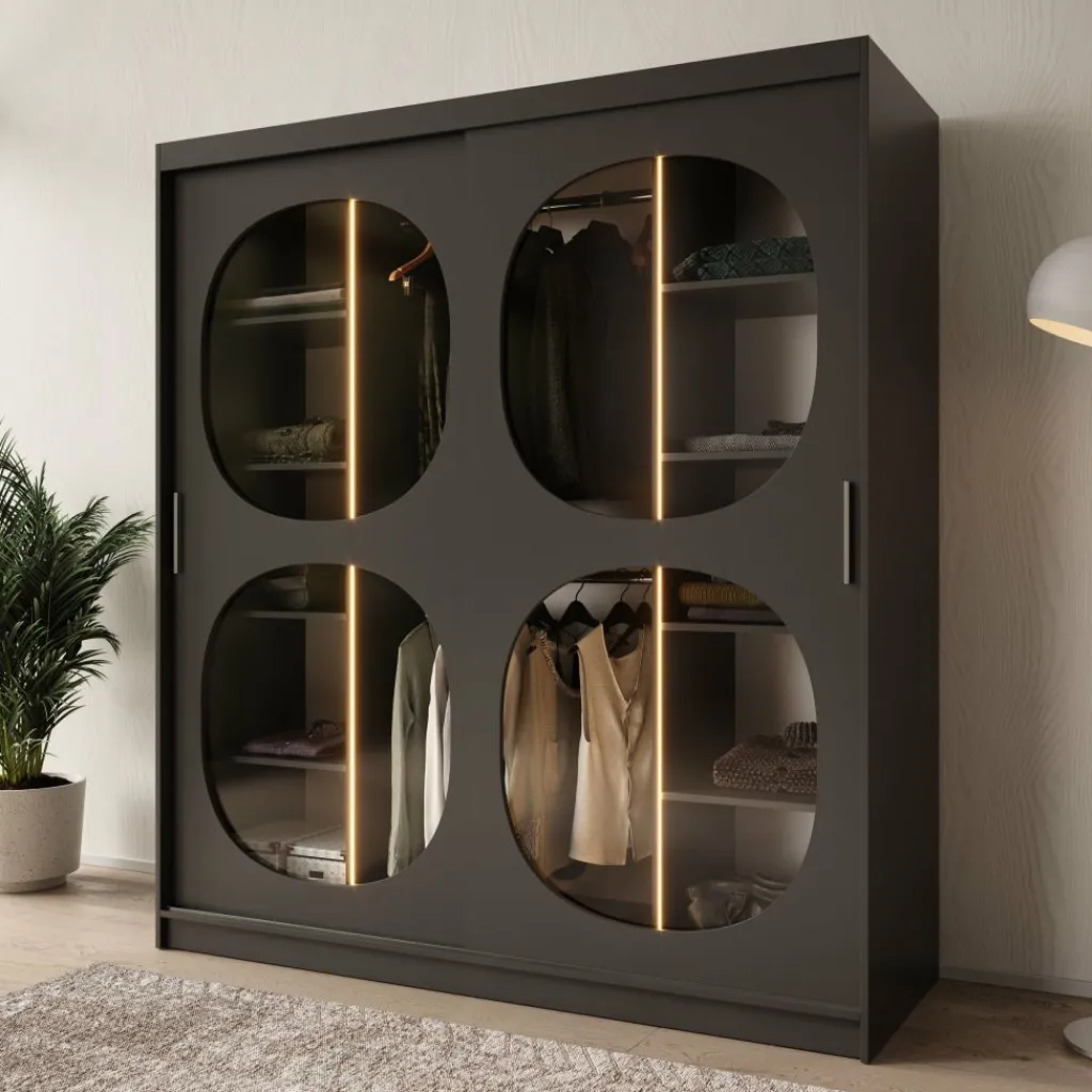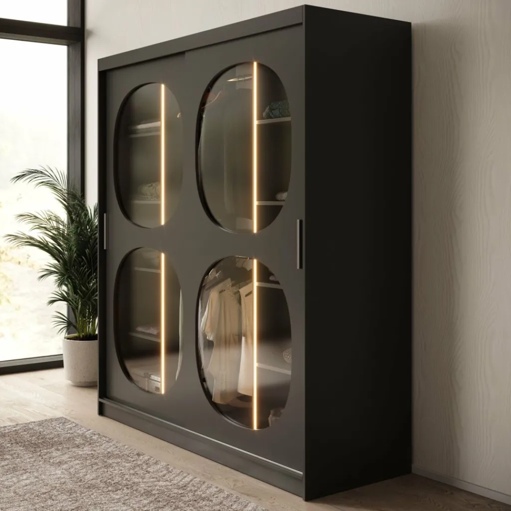 De Bravanti kledingkast in zwart van 180 cm breed biedt extra ruimte zonder aan stijl in te boeten. De diepe, matzwarte kleur en afgeronde glazen panelen zorgen voor een eigentijdse en luxe uitstraling. De ingebouwde LED-verlichting accentueert het interieur van de kast en brengt een warme sfeer in de slaapkamer.