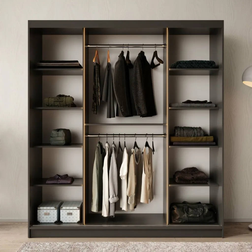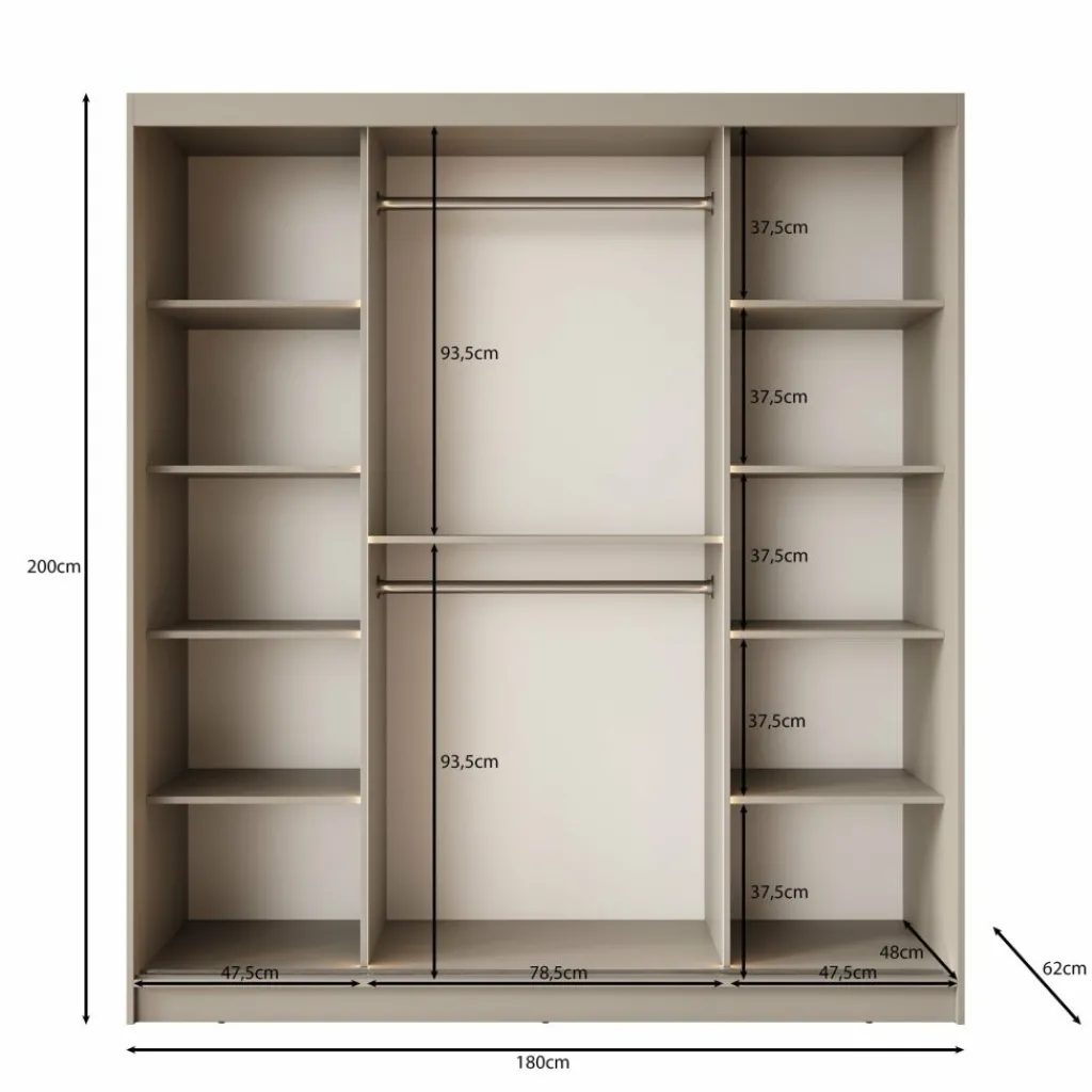 Binnenin vind je een praktische indeling met ruime legplanken en een brede hangsectie, perfect voor het overzichtelijk opbergen van kleding, schoenen en accessoires.
