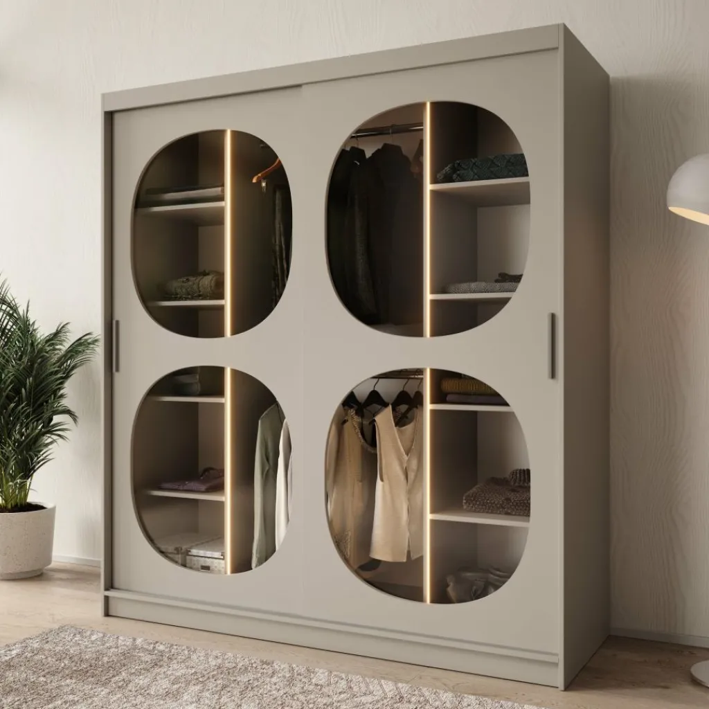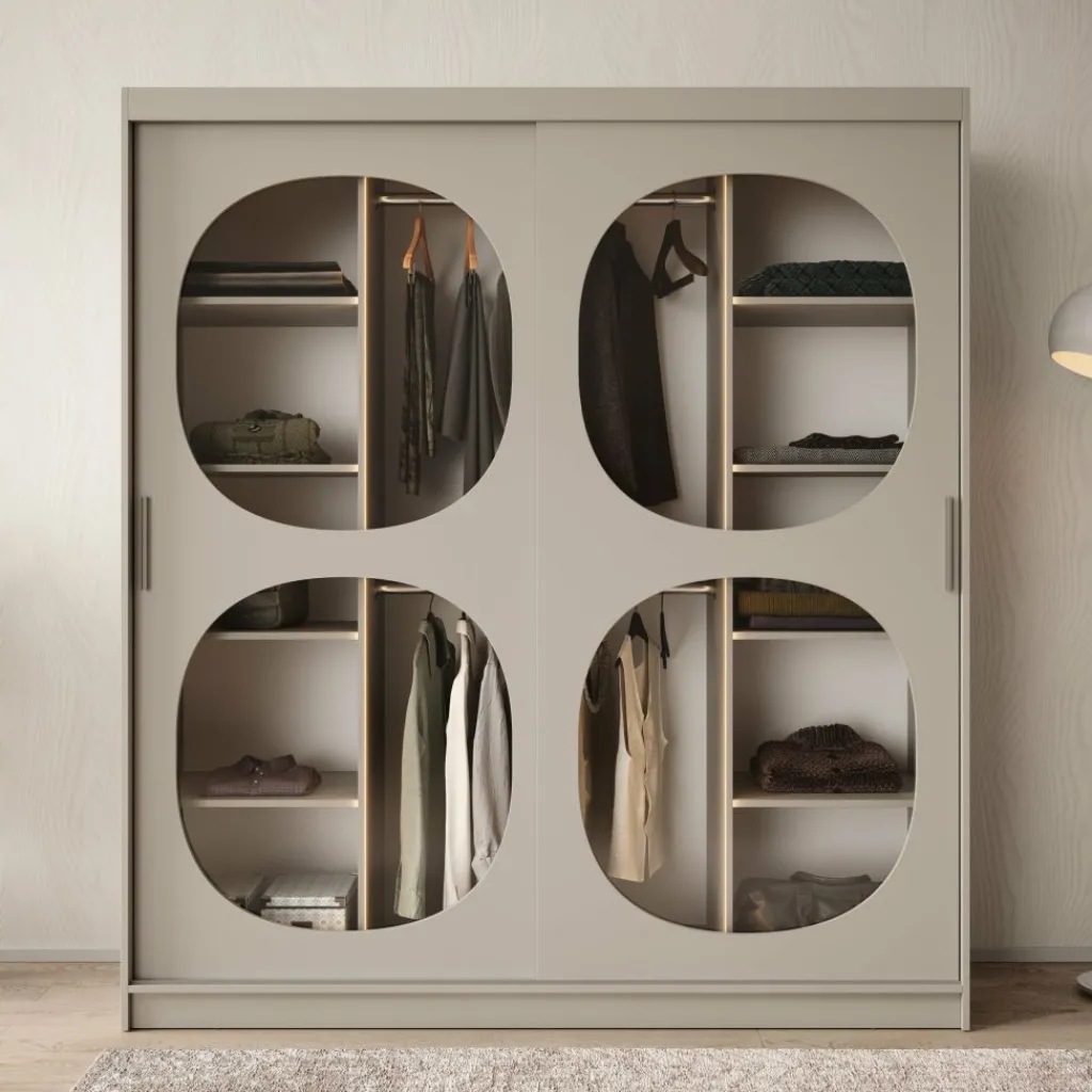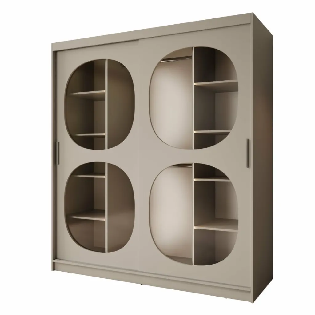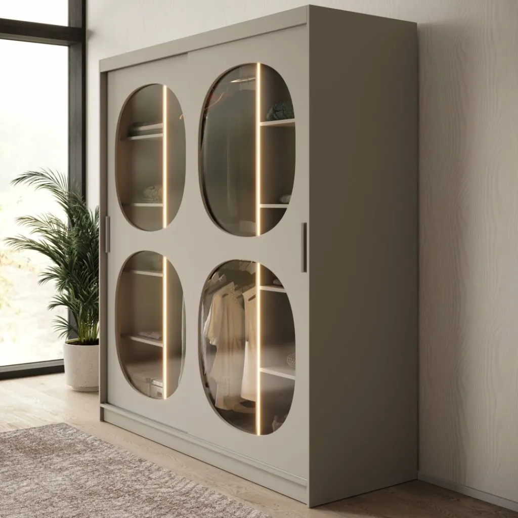 De Bravanti kledingkast in beige van 180 cm breed is een stijlvolle blikvanger die elegantie en rust uitstraalt. De lichte beige kleur en afgeronde glazen panelen geven het meubel een verfijnde, moderne uitstraling. Dankzij de geïntegreerde LED-verlichting krijgt het interieur een warme, uitnodigende gloed.