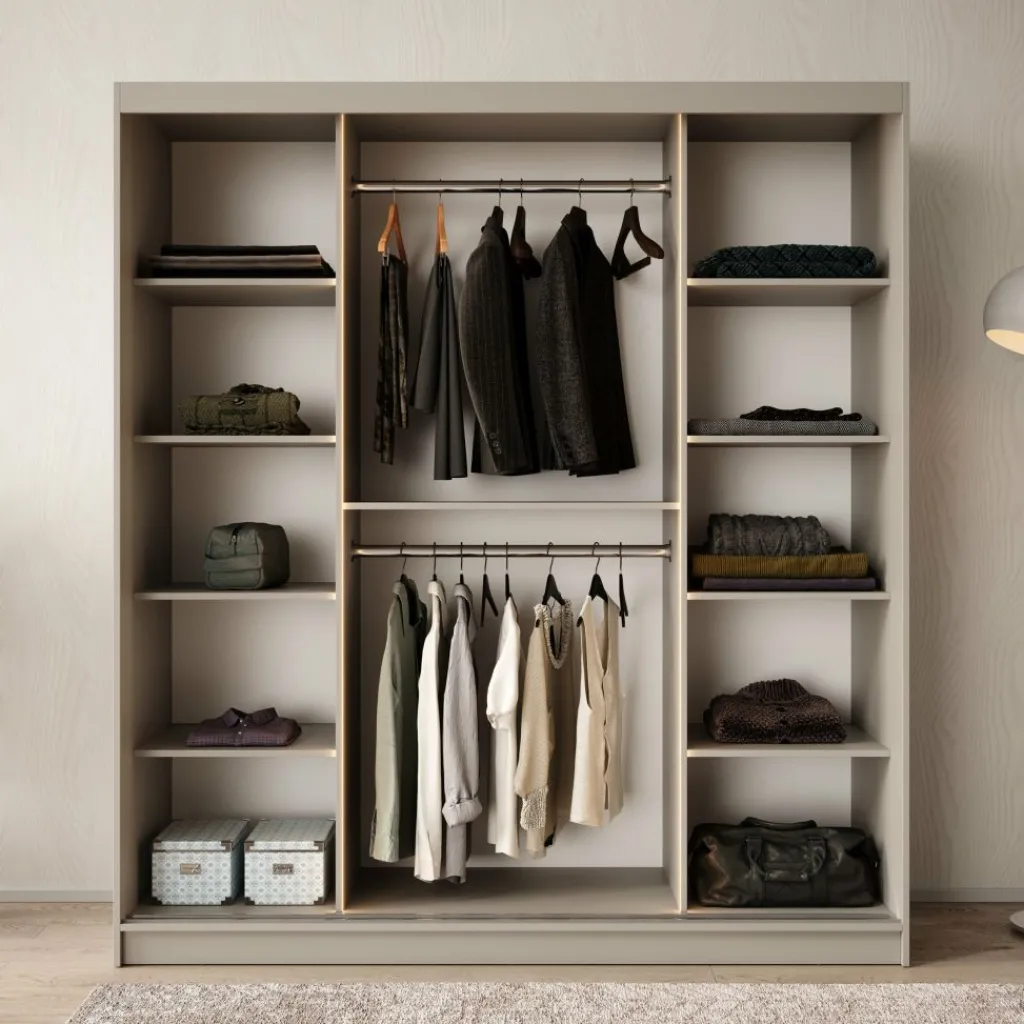 De kast beschikt over meerdere legplanken en een ruime hangsectie, zodat je al je kleding en accessoires overzichtelijk kunt opbergen.