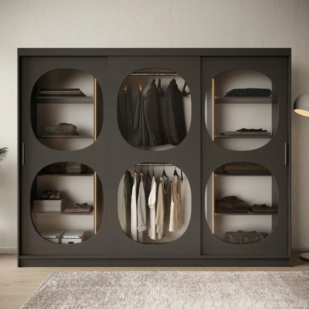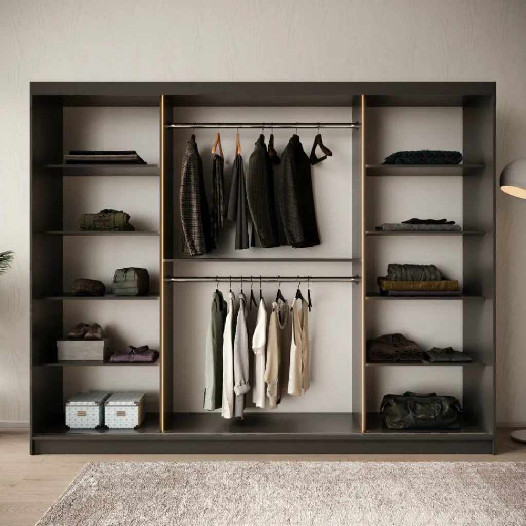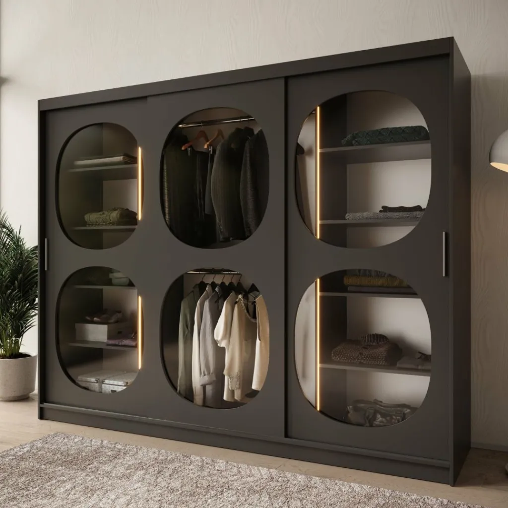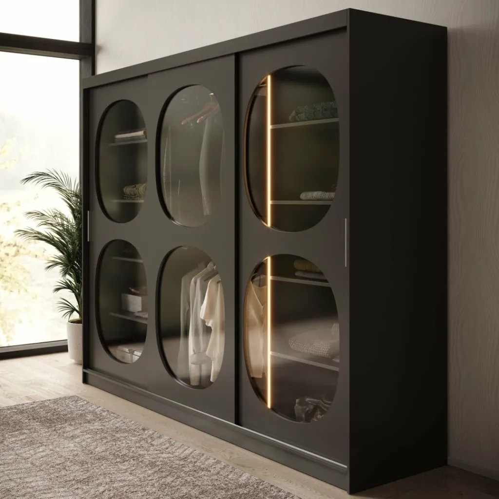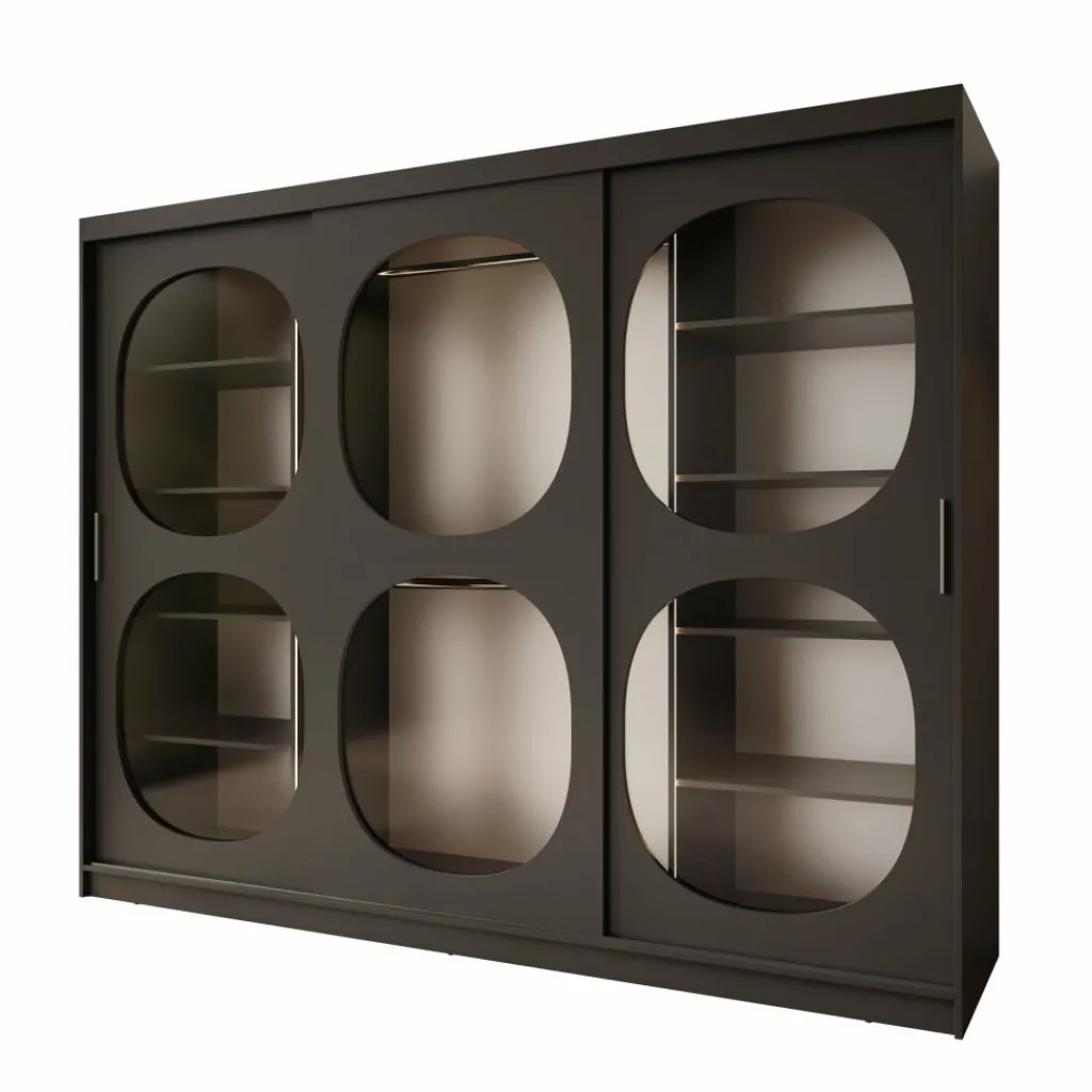 De Bravanti kledingkast in zwart van 250 cm breed is de ultieme combinatie van luxe, ruimte en design. De matzwarte afwerking en afgeronde glazen panelen geven de kast een moderne, stijlvolle uitstraling die meteen in het oog springt. De geïntegreerde LED-verlichting benadrukt de strakke lijnen en zorgt voor een warme, uitnodigende sfeer.