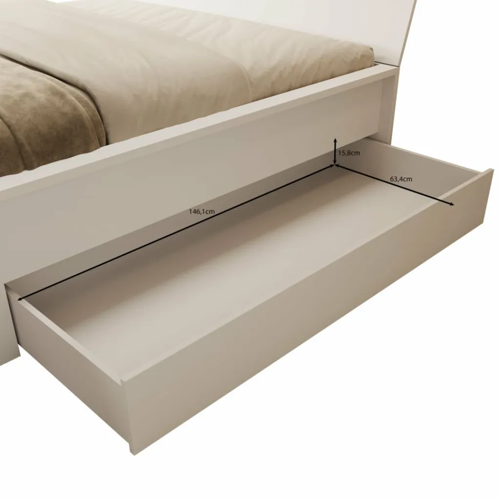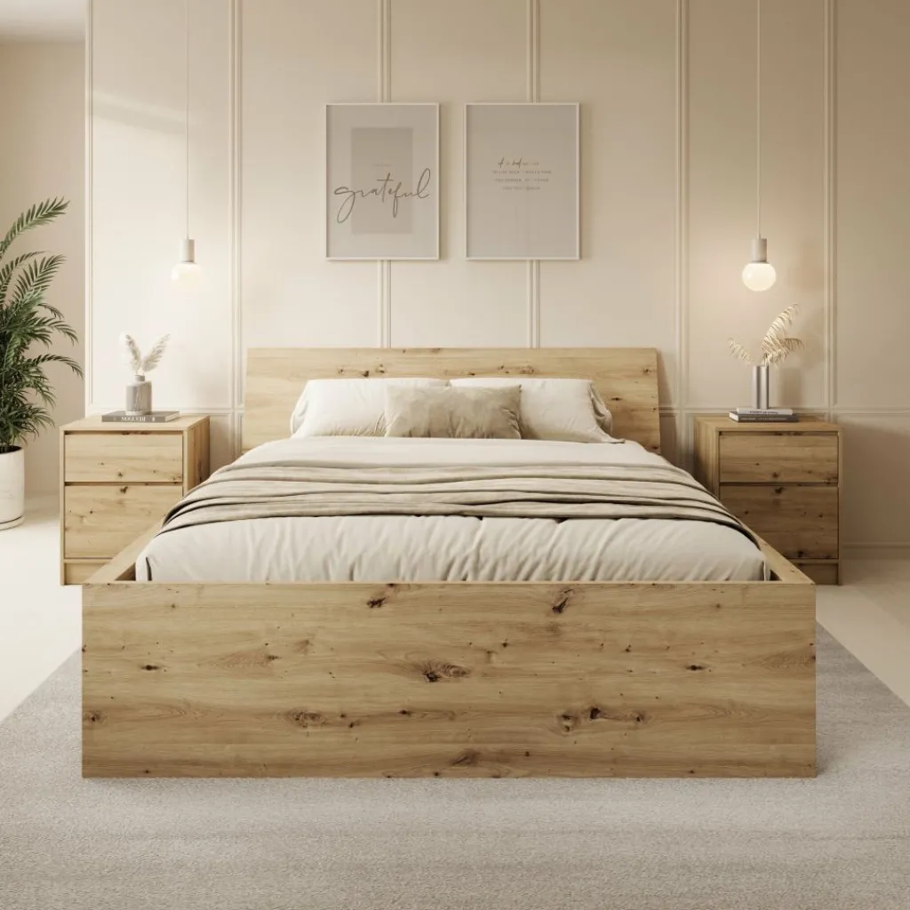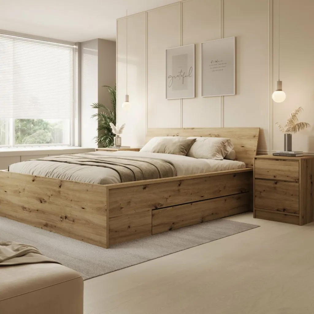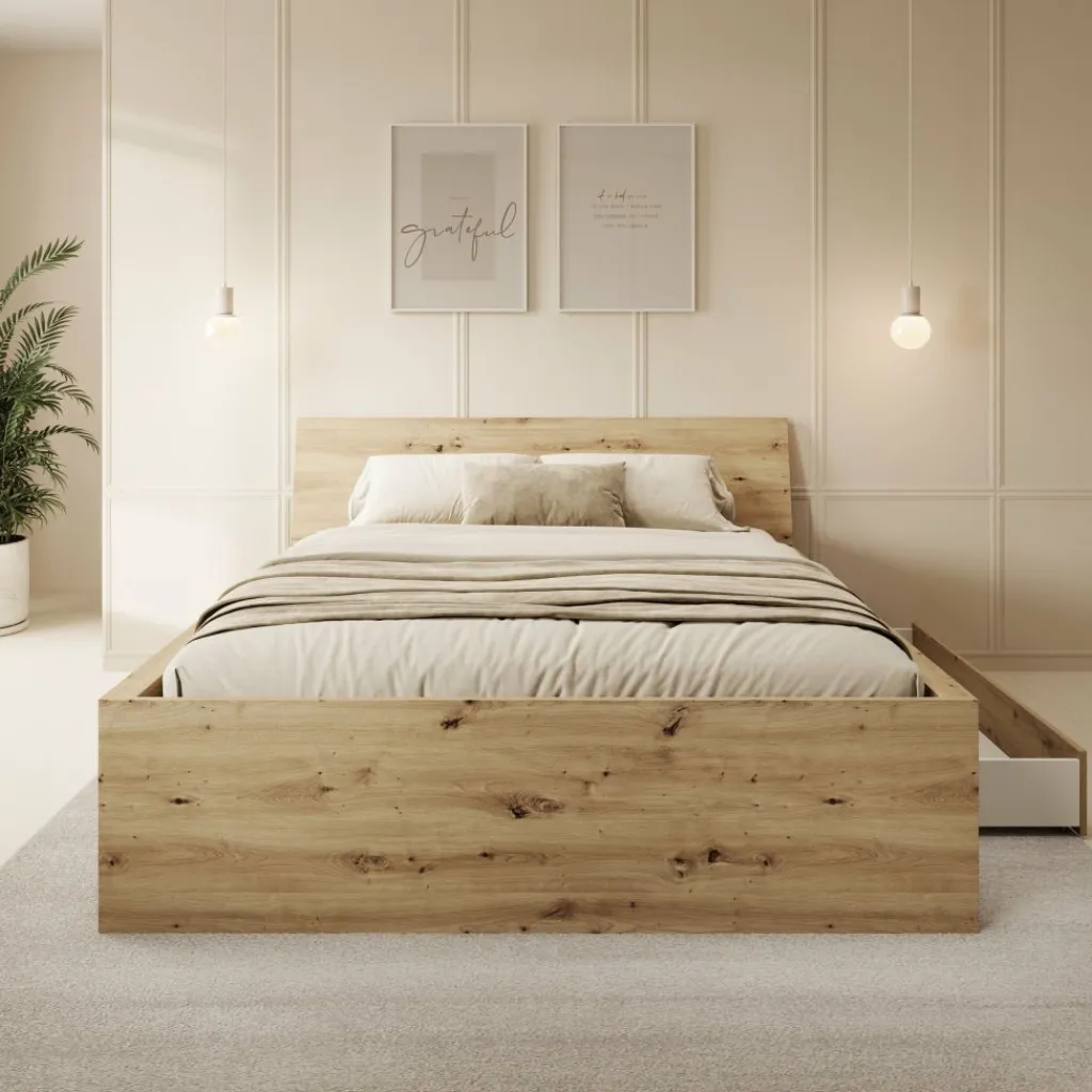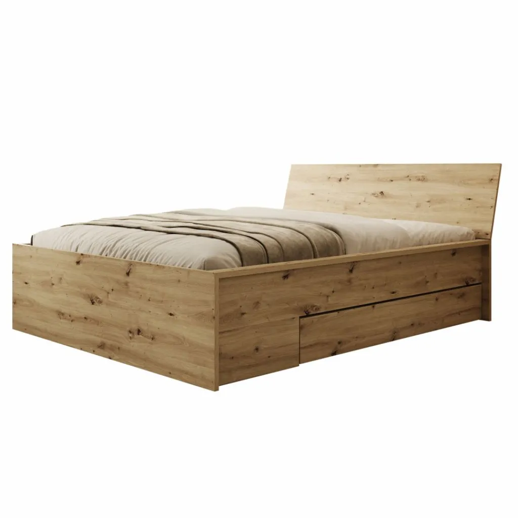 Tweepersoonsbed Brett is een bed geschikt voor matrasmaat 160×200 cm. Het bed is uitgevoerd in de kleur eiken en beschikt over 1 grote lade. Deze lade is enorm handig voor als je extra opbergruimte nodig hebt. Het bed wordt zonder matras en zonder lattenbodem geleverd.