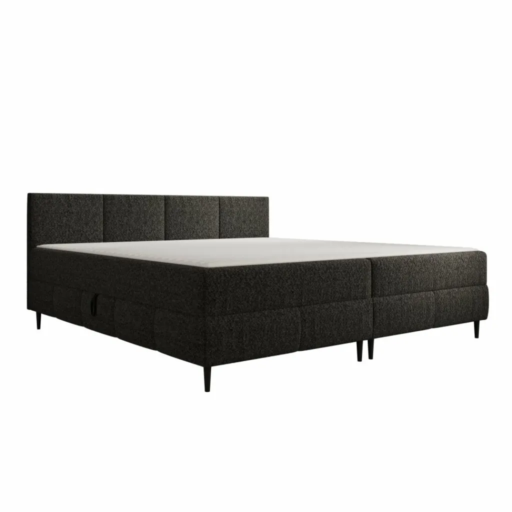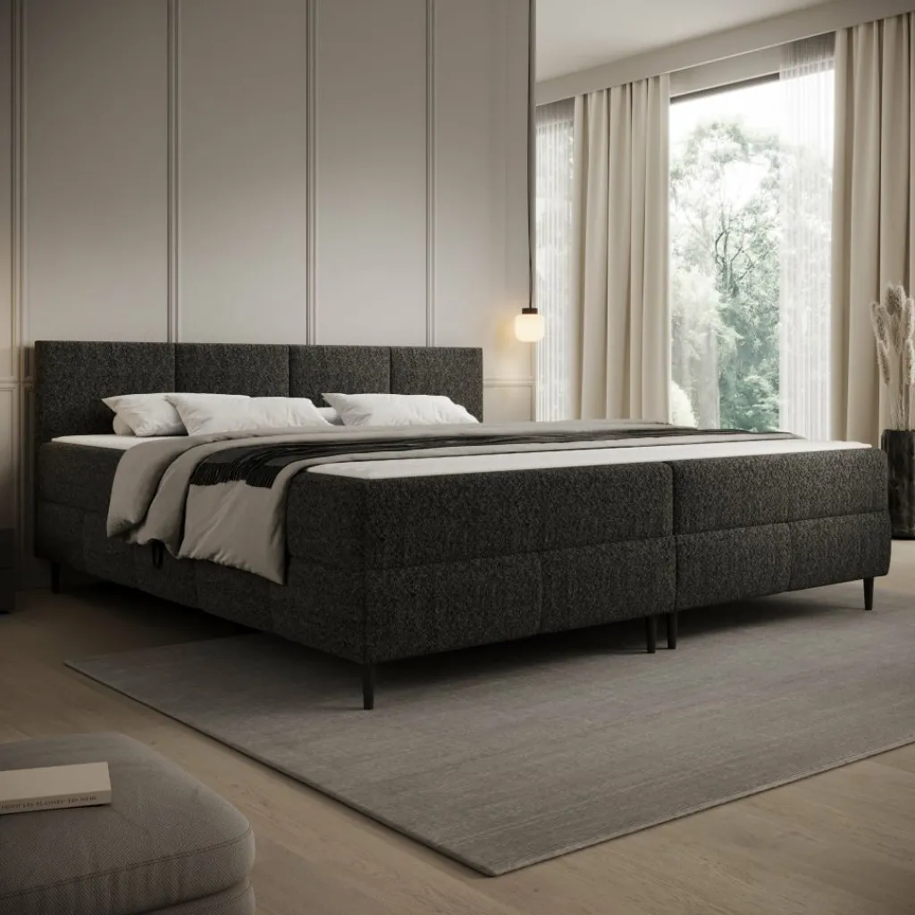 De Brisa boxspring in 200×200 cm is een royale en praktische slaapopstelling met geïntegreerde opbergruimte. Het frame bestaat uit 16 mm meubelplaat in combinatie met hout. Het hoofdbord is voorzien van 2 cm T25-schuim voor comfortabele ondersteuning.