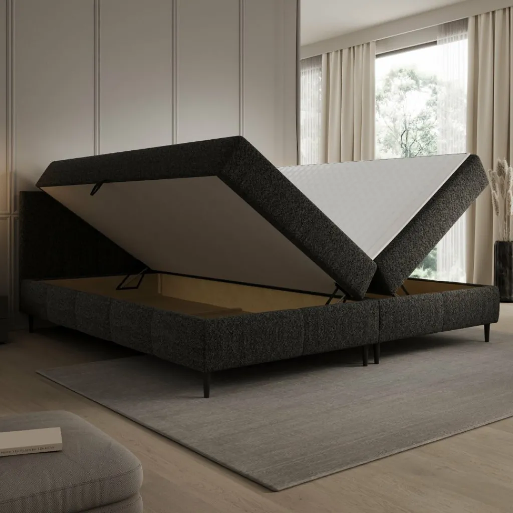 Onder beide matrassen bevindt zich een groot opbergvak met een draagvermogen van 10 kg per zijde. Dankzij het lichte openingsmechanisme met lus en veringen kun je de matrassen eenvoudig omhoog brengen.