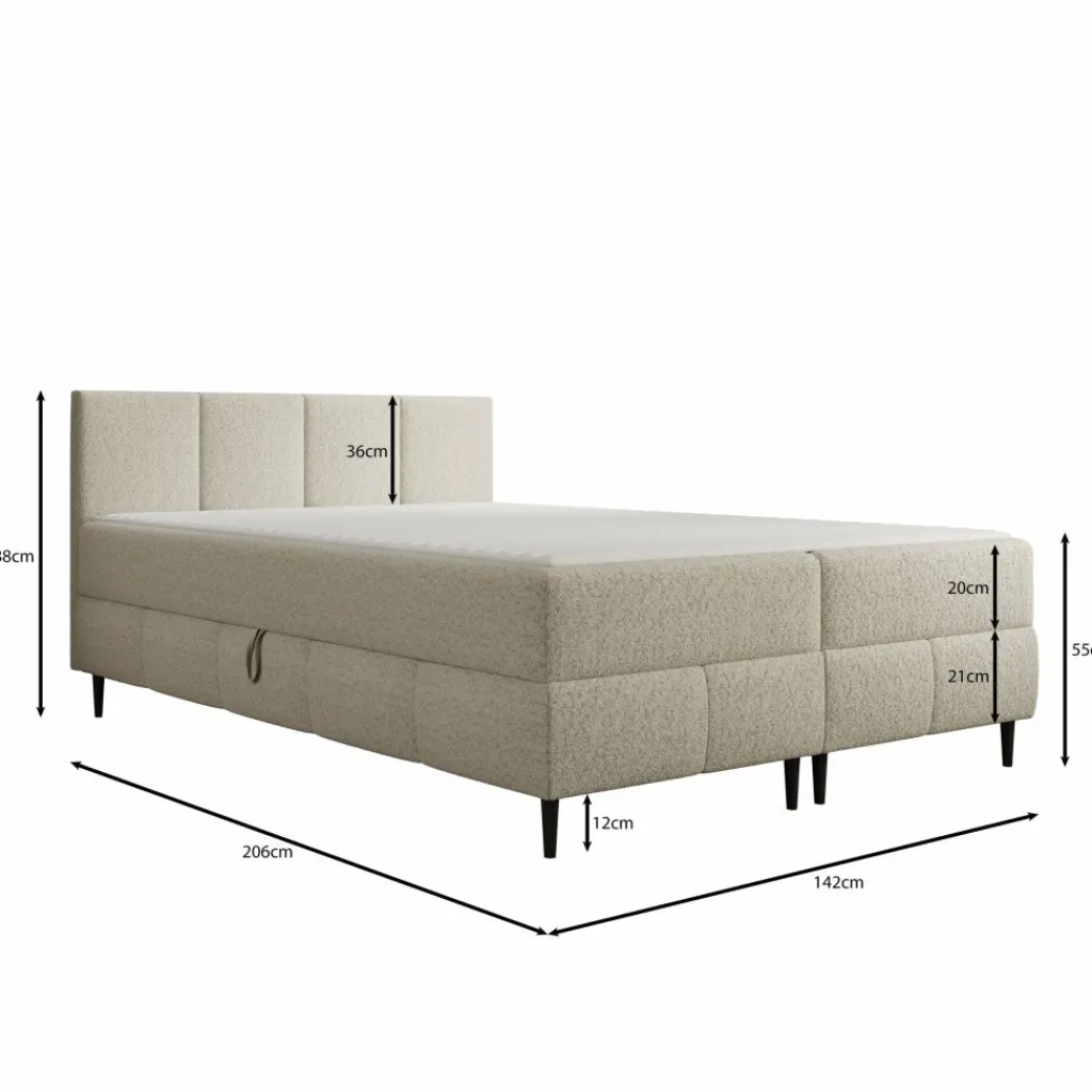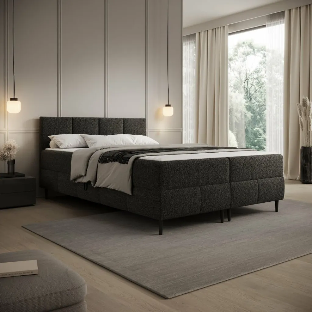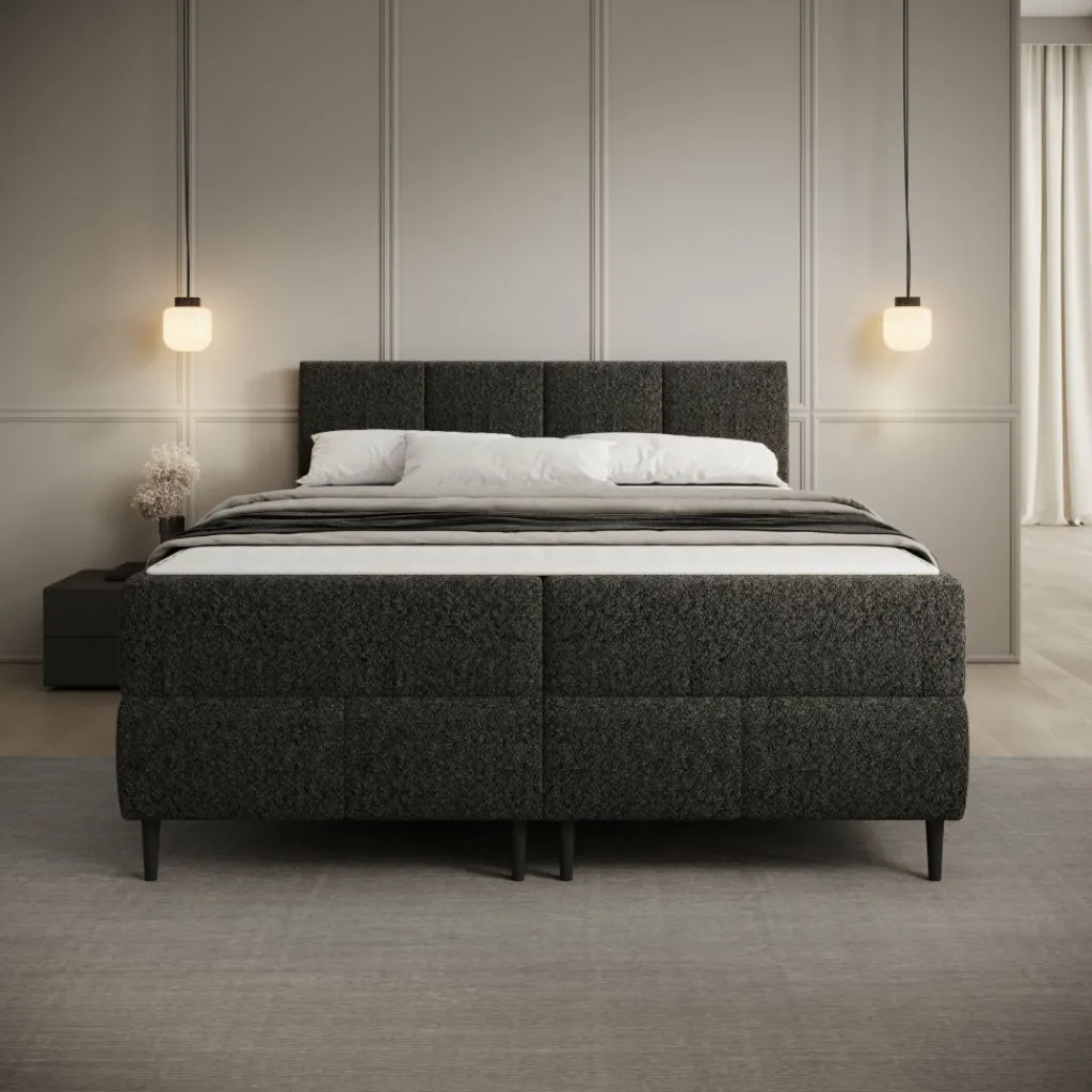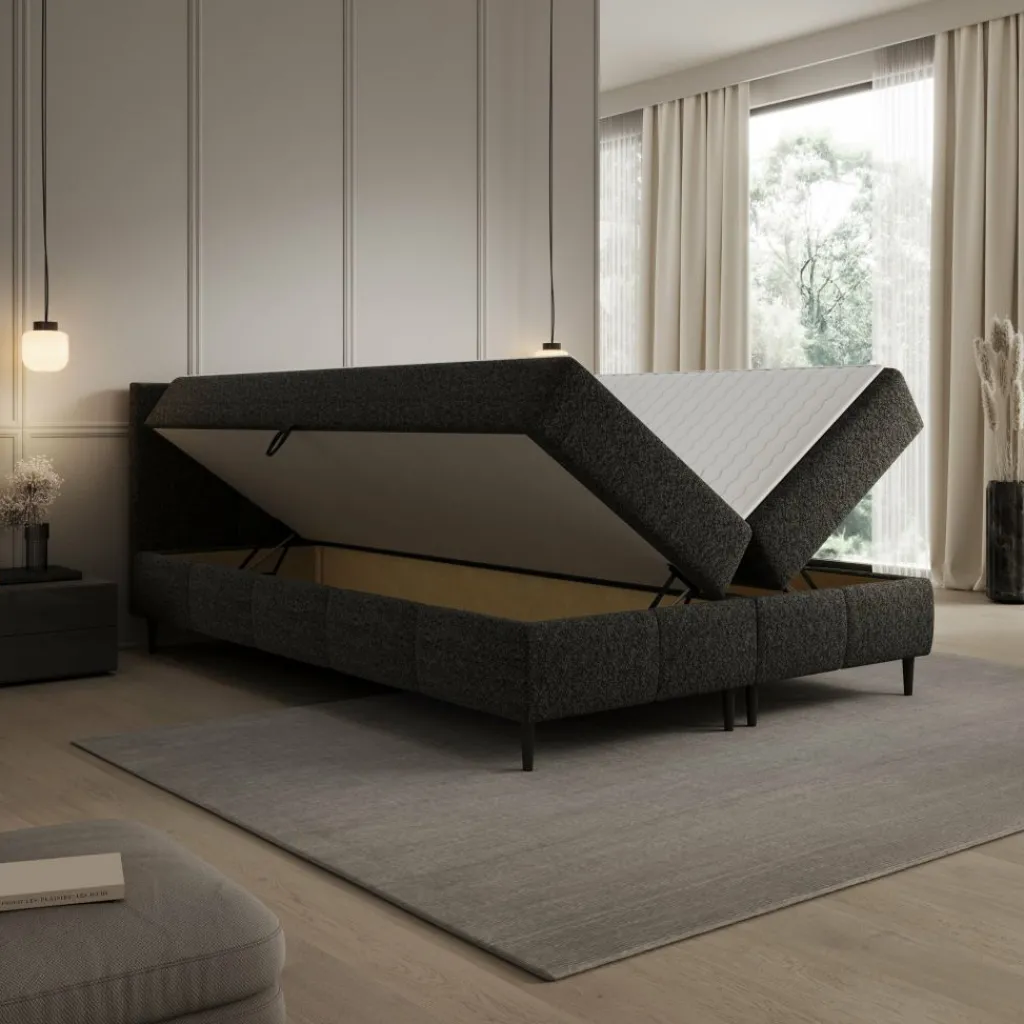 De Brisa boxspring is een praktische slaapoplossing met geïntegreerde opbergruimte en een zachte teddystof bekleding in zwart. Het frame bestaat uit 16 mm meubelplaat in combinatie met hout. Het hoofdbord heeft dezelfde constructie en is voorzien van 2 cm T25-schuim voor comfortabele ondersteuning tijdens het zitten.