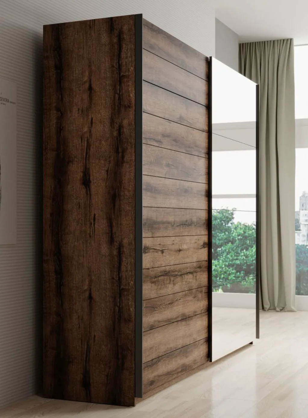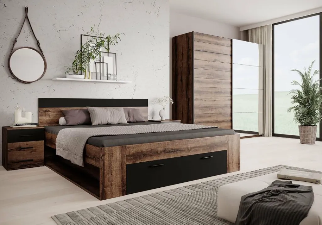 Deze tijdloze meubelcollectie combineert warme eiken houttinten met strak zwart en past moeiteloos in ieder modern interieur. De set bestaat uit een royaal tweepersoonsbed, twee nachtkastjes en een ruime kledingkast met spiegeldeur.