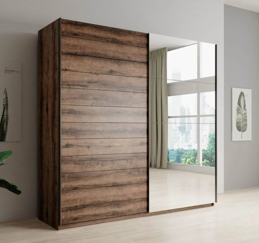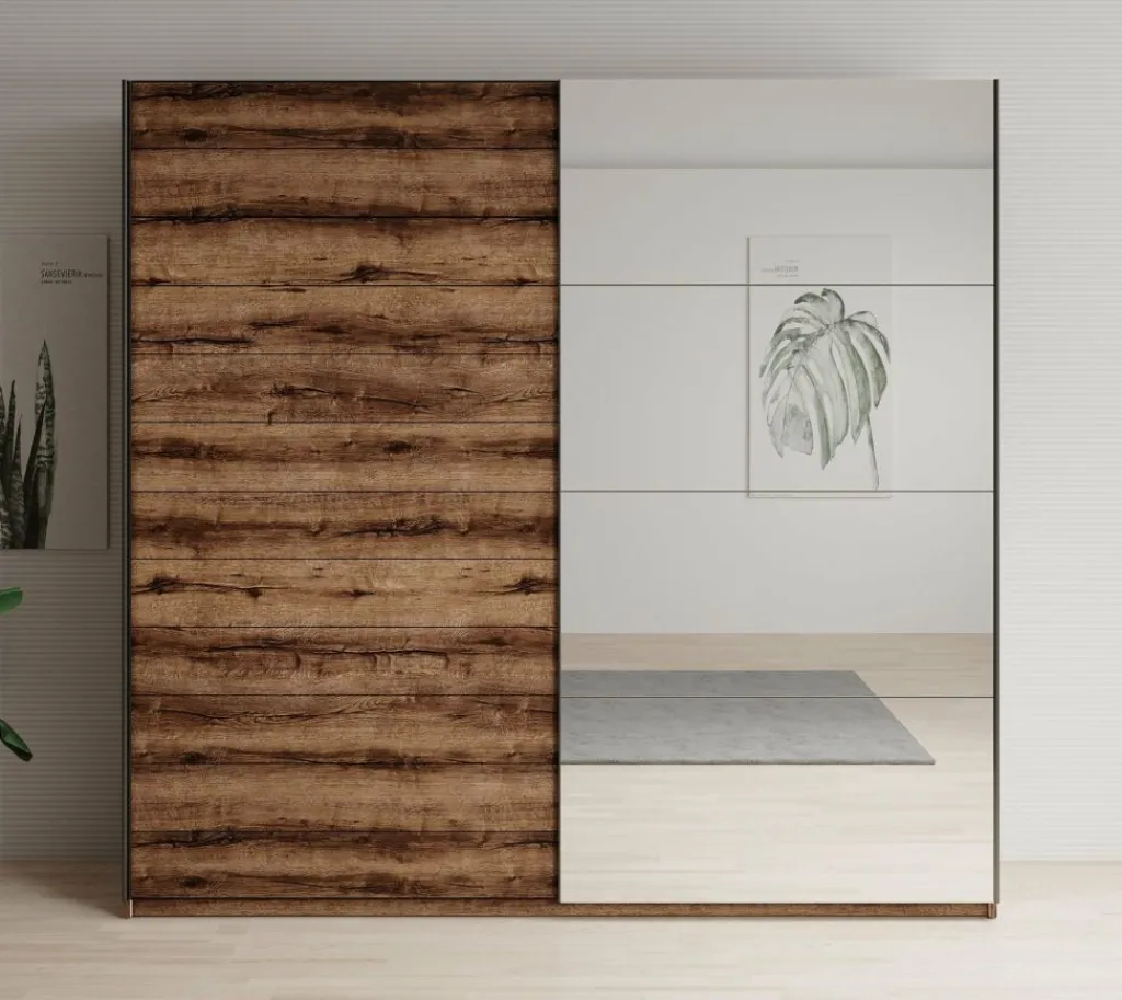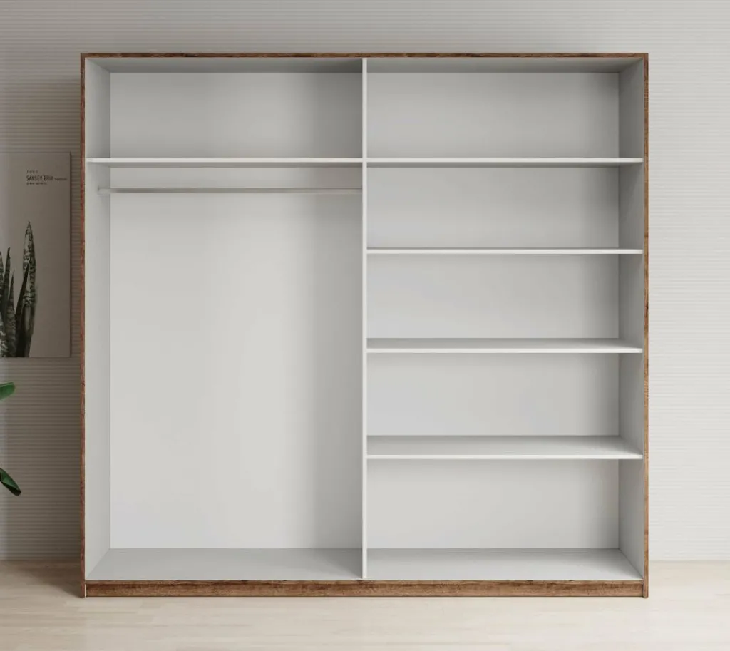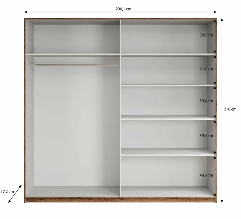 De schuifdeurkast (200 × 57 × 210 cm) is voorzien van een grote spiegeldeur en zwarte verticale grepen. Achter de deuren vind je één breed hanggedeelte en zes praktische legplanken – perfect om al je kleding overzichtelijk op te bergen.