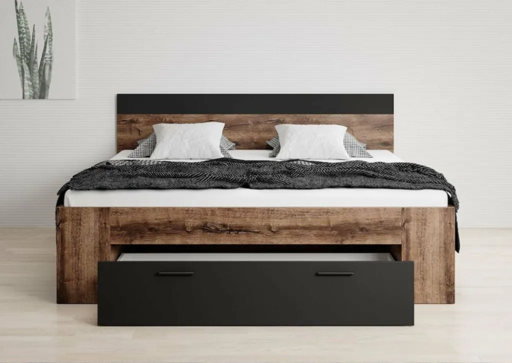 Het bedframe is uitgevoerd in stevig spaanplaat met een sfeervolle houtstructuur en zwarte accenten. Dankzij de royale afmetingen (188 × 205 × 90 cm) en de handige opberglade aan het voeteneinde combineert dit bed comfort met extra bergruimte. Geschikt voor een matrasmaat van 180 × 200 cm. Matras en lattenbodem zijn niet inbegrepen.