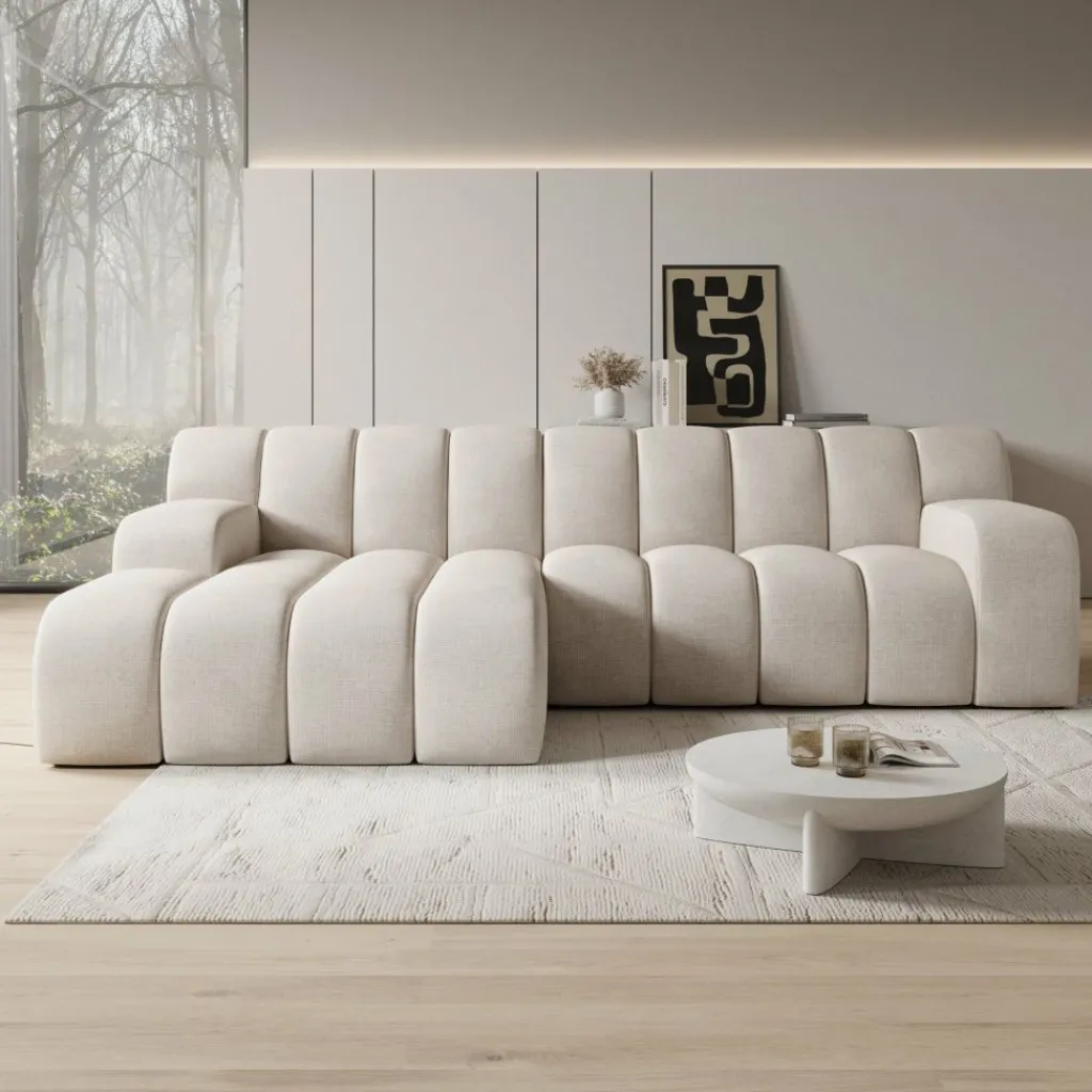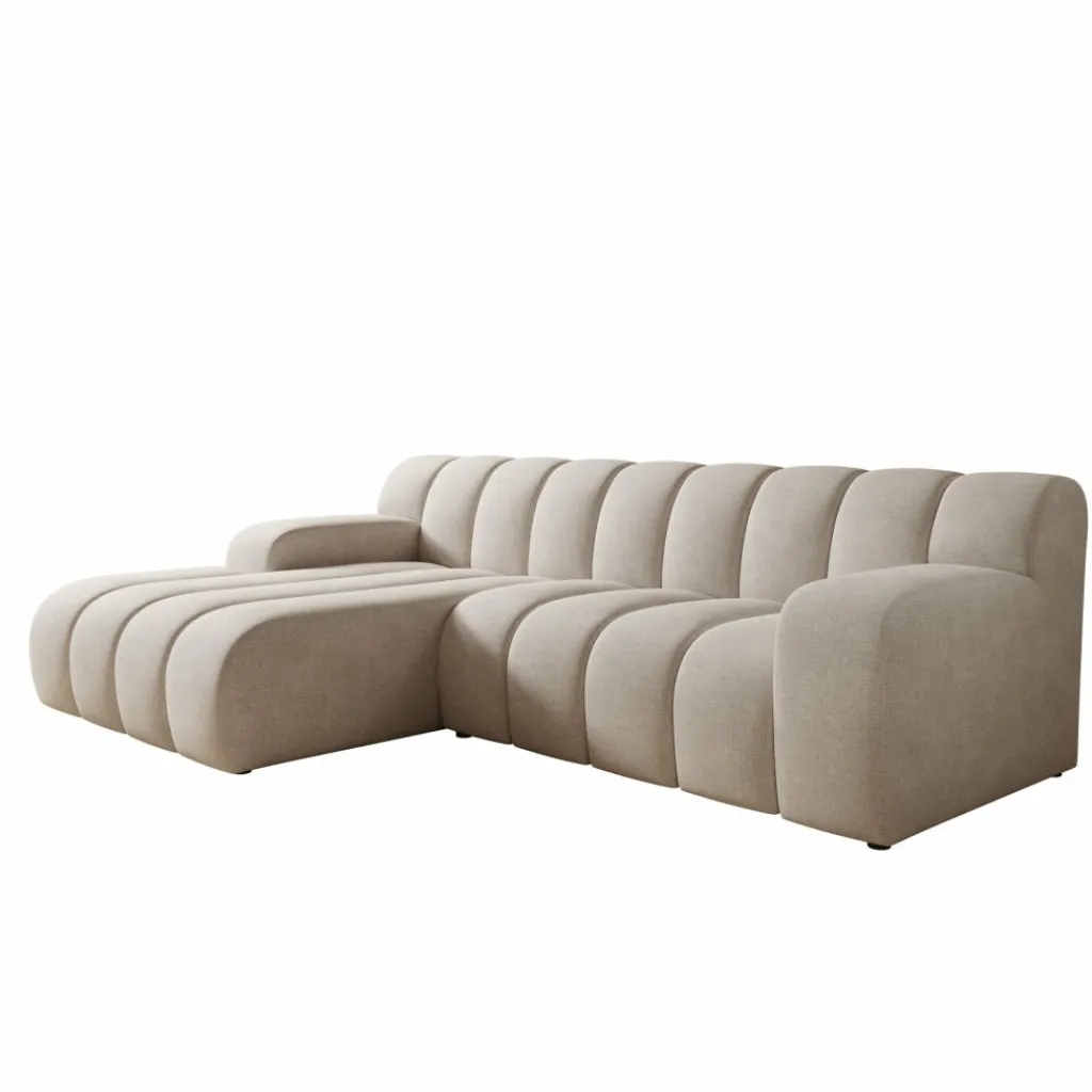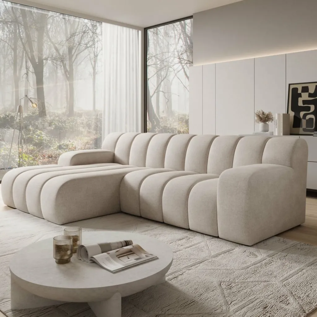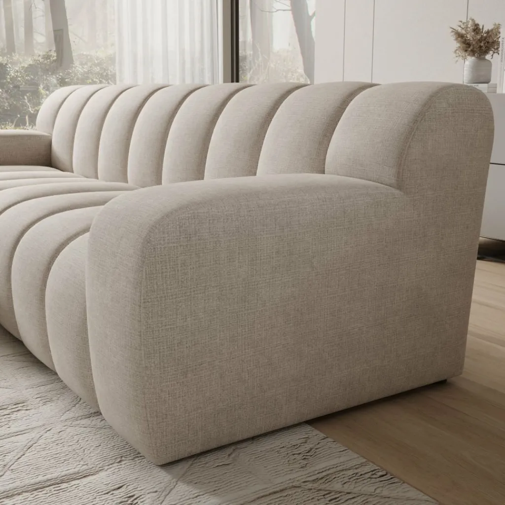 Stijlvol in elk interieur De warme beige stofkleur en de ronde, geribbelde vormgeving passen goed bij een modern of minimalistisch interieur. De bank trekt de aandacht zonder te overheersen.