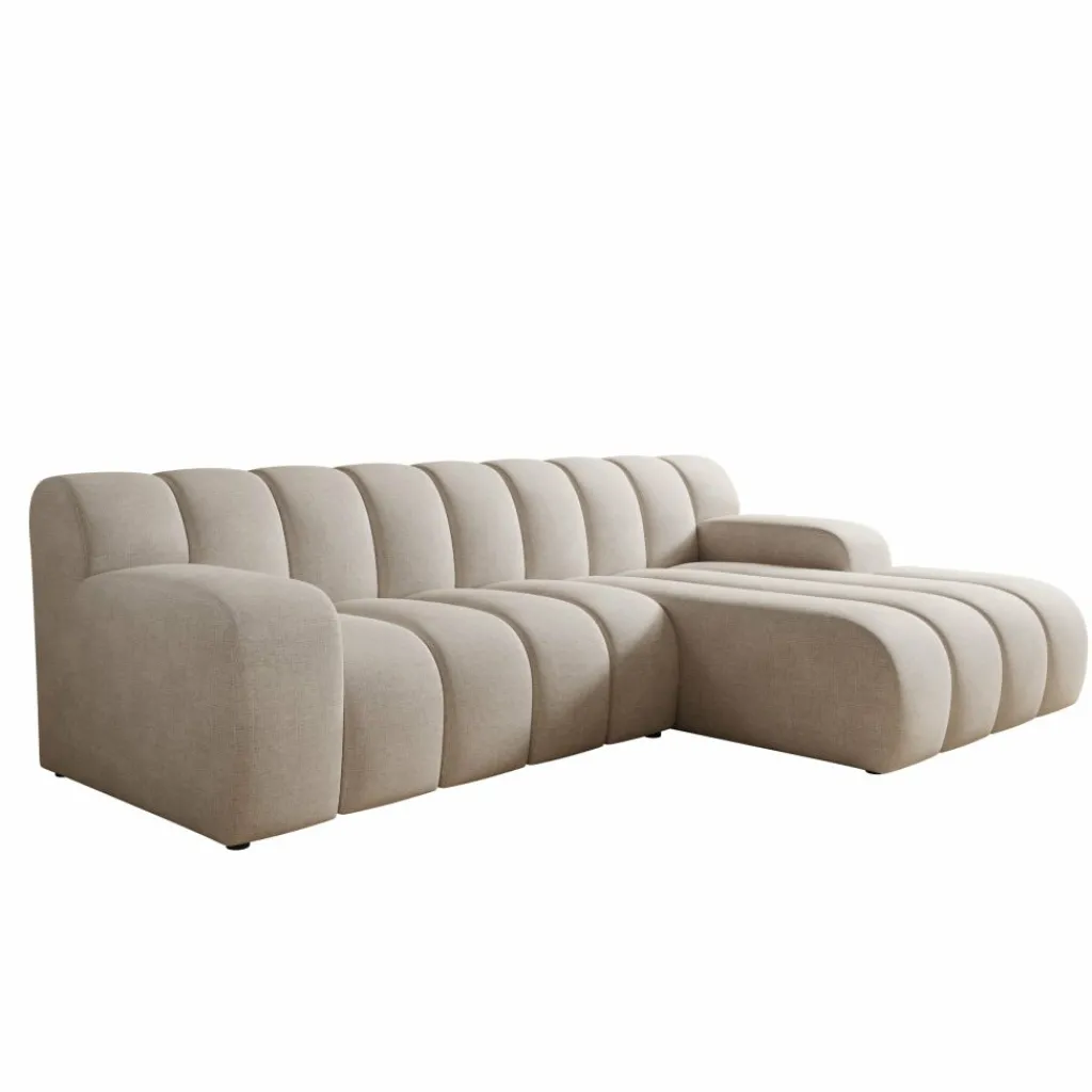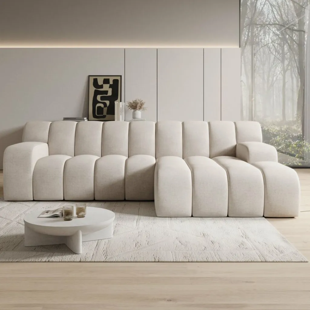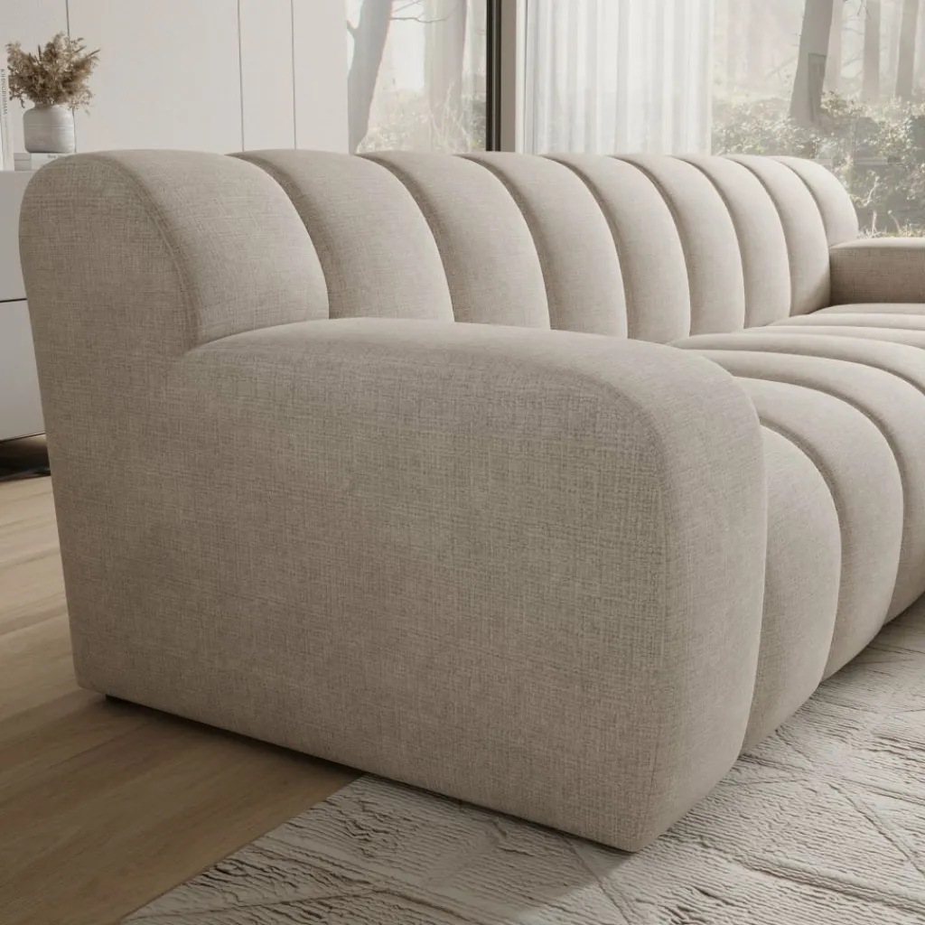Stijlvol in elk interieur De warme beige stofkleur en de ronde, geribbelde vormgeving passen goed bij een modern of minimalistisch interieur. De bank trekt de aandacht zonder te overheersen.