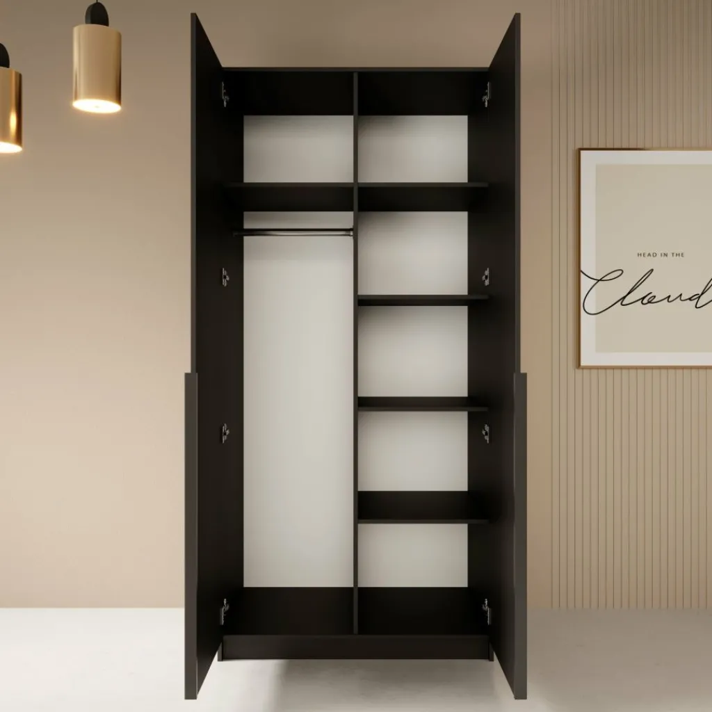 De kast is 100 cm breed, 215 cm hoog en 58 cm diep. Achter de deuren vind je een slimme indeling met vijf legplanken en een royale hangruimte. Ideaal voor het overzichtelijk opbergen van kleding, accessoires of beddengoed. De metalen kledingroede en stevige plankdragers zorgen voor langdurig gebruiksgemak.