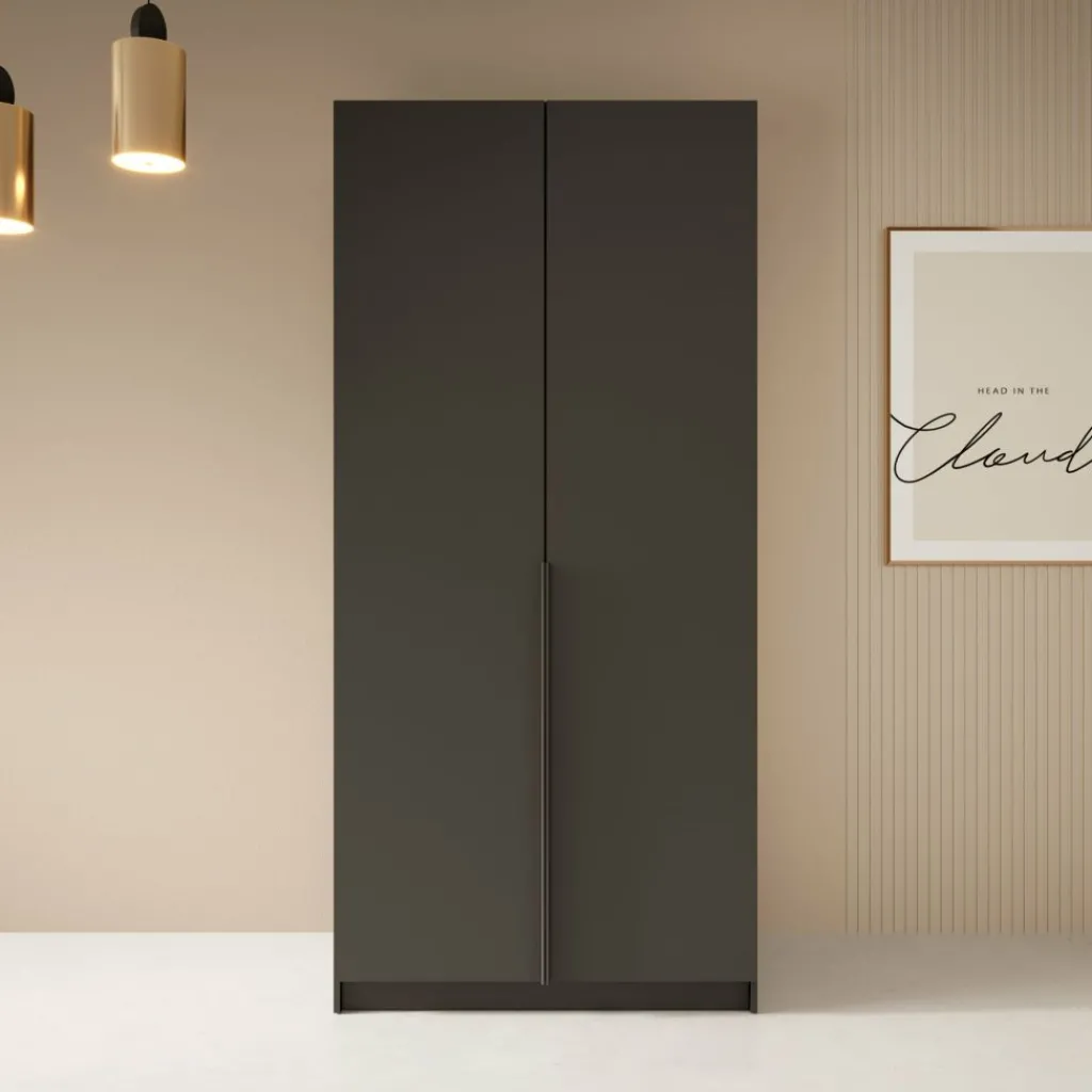 Kledingkast Bruno is een moderne en praktische kast met een stijlvolle uitstraling. De kast is uitgevoerd in zwart met een slanke, zwarte handgreep over de volledige lengte van de deuren. Dankzij het tijdloze ontwerp past deze 2-deurs kledingkast perfect in uiteenlopende interieurs.